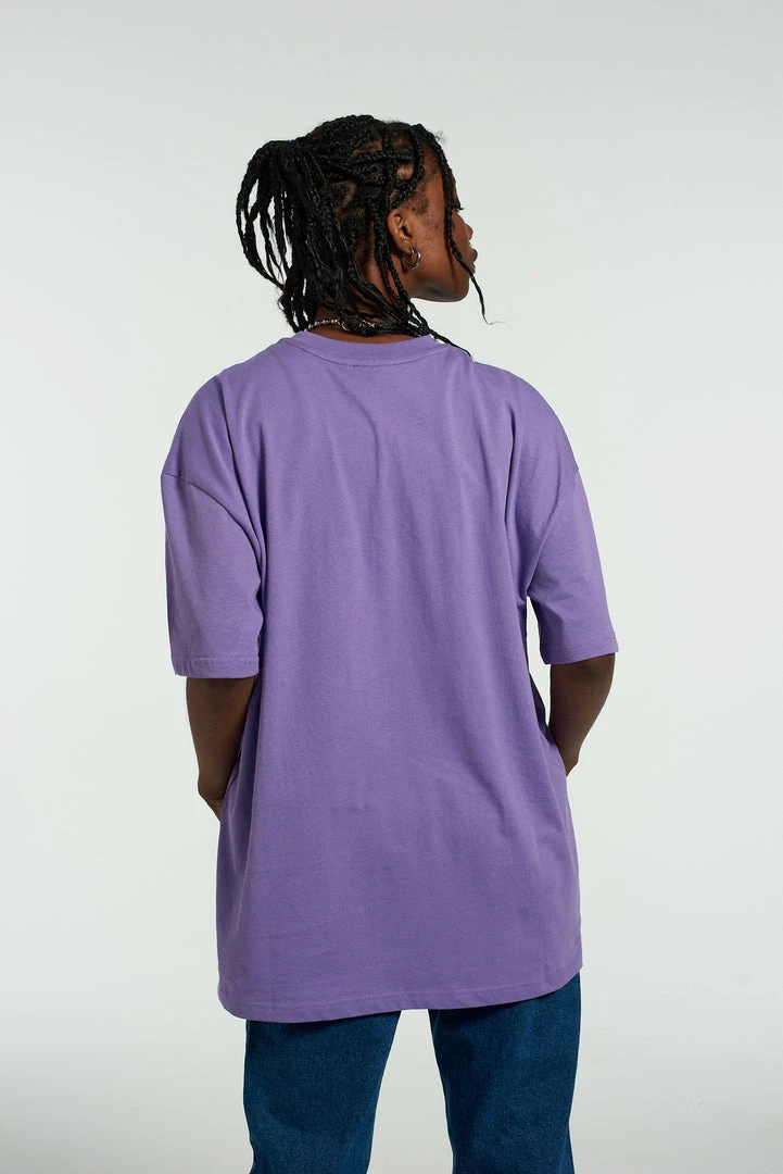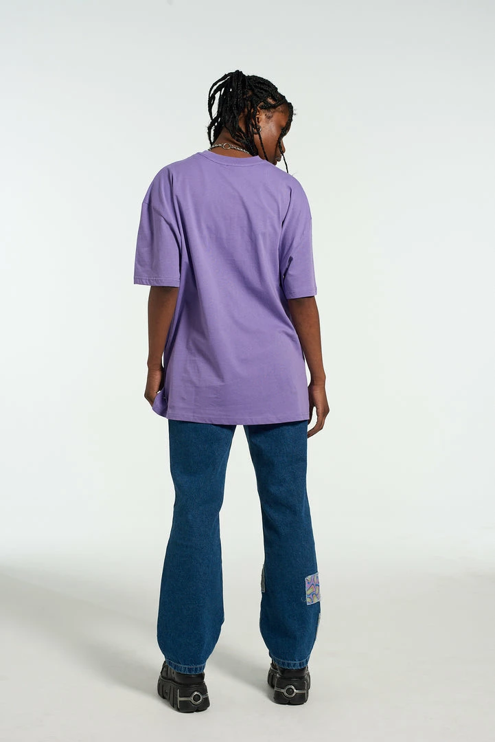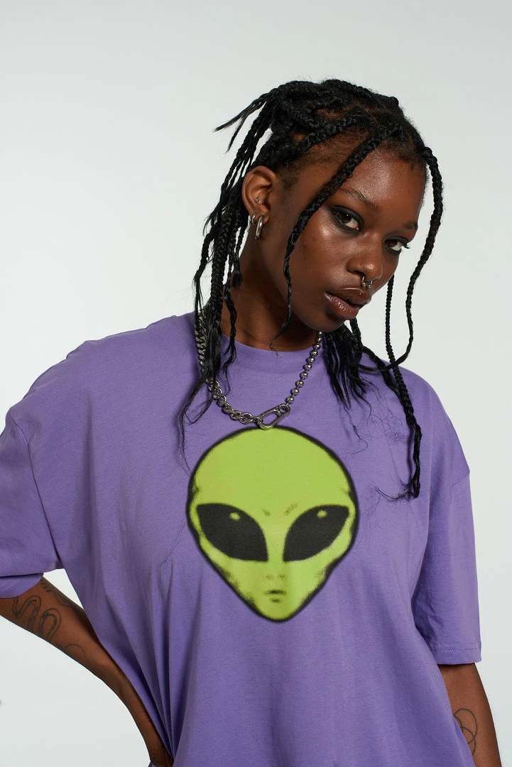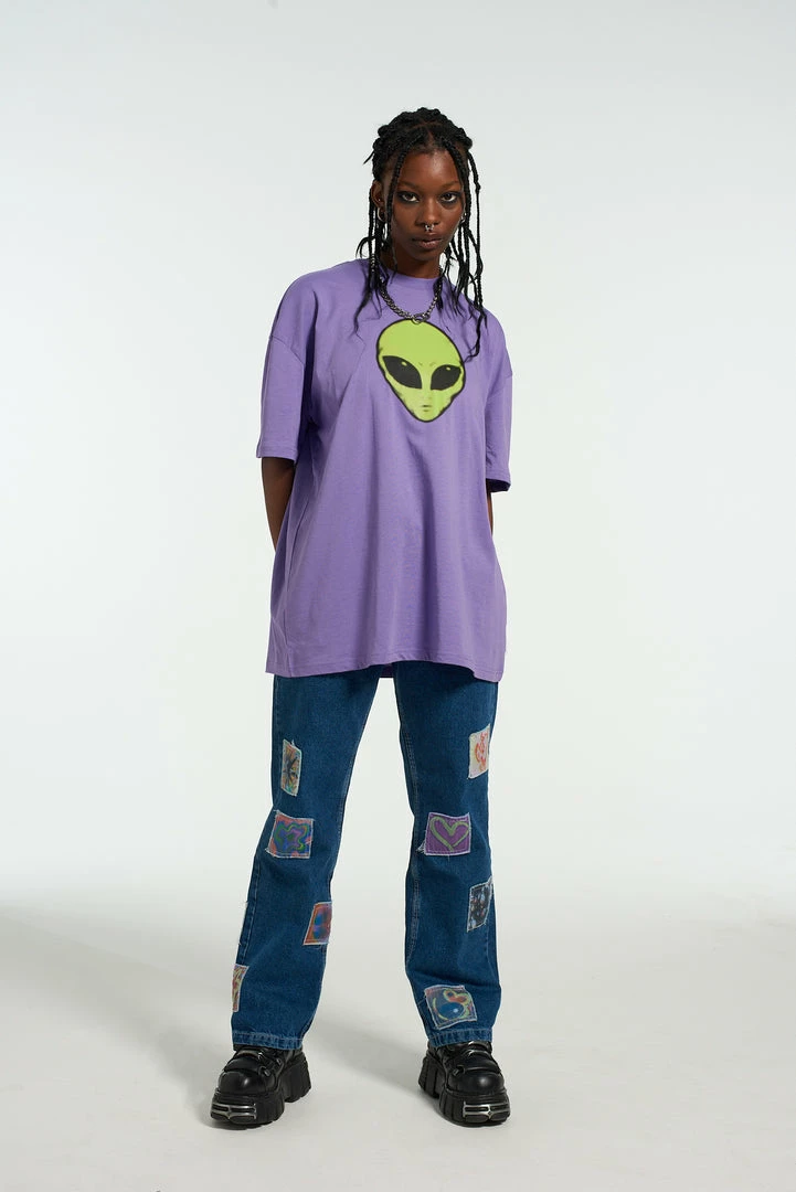The Ragged Priest Purple oversized t-shirt with green alien central print.