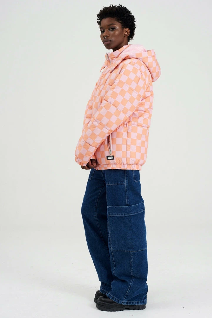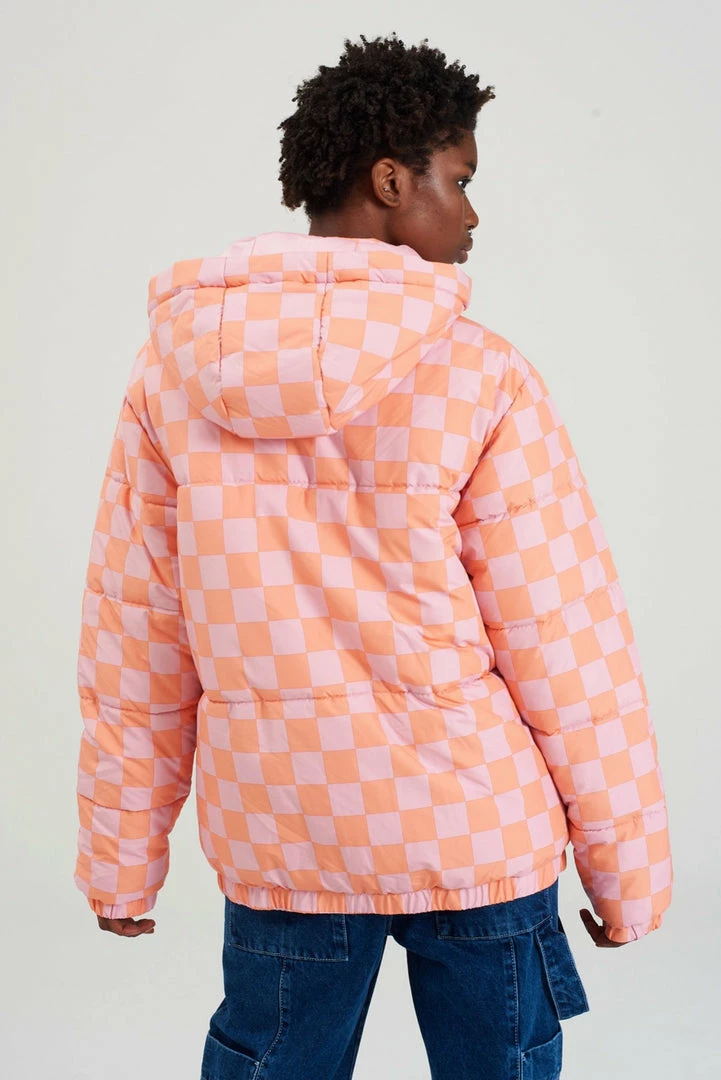 Ragged Jeans pink & orange checkerboard pattern printed puffer coat with hood.