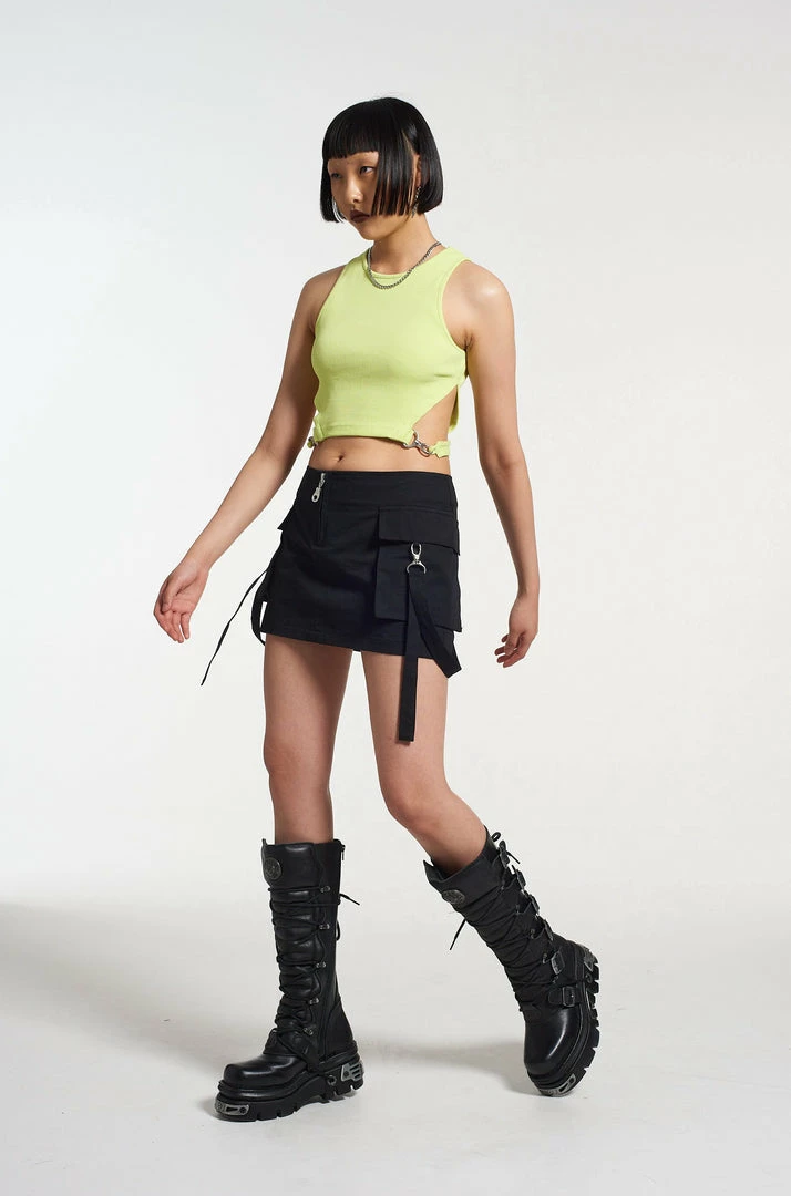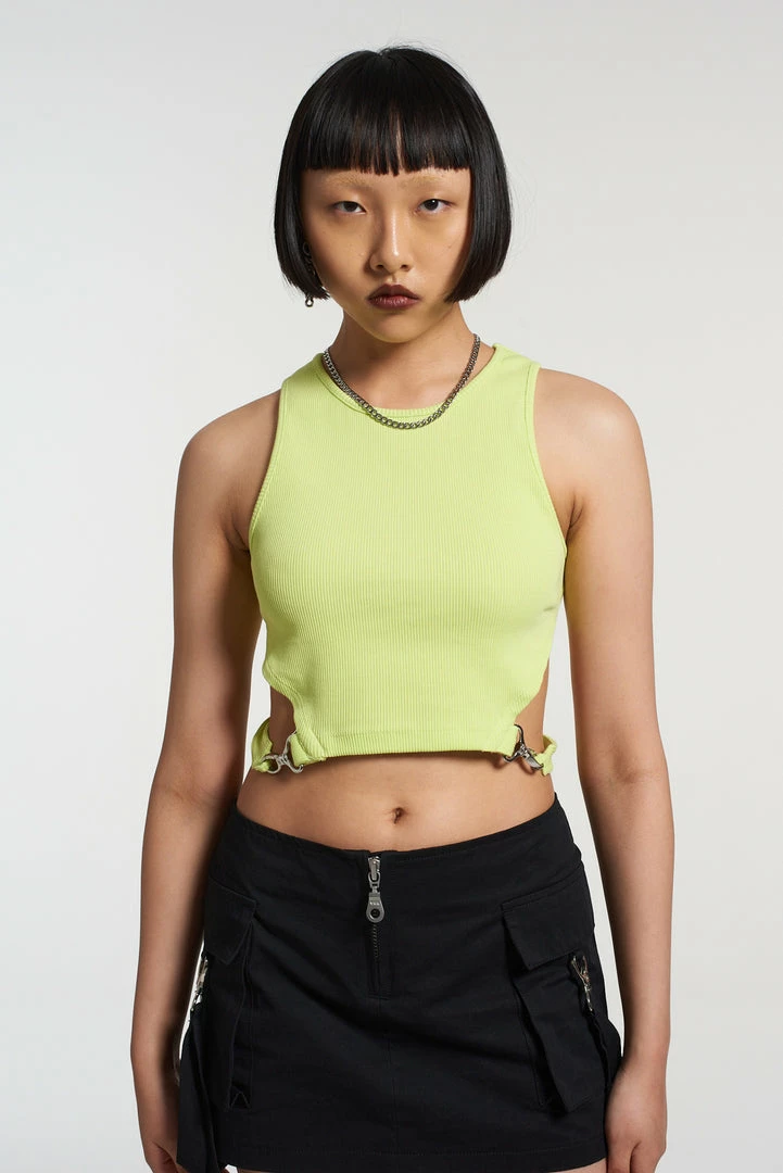 The Ragged Priest lime green crop top. Crew neck, cropped fit with cut out waist detail and silver trigger hook straps.