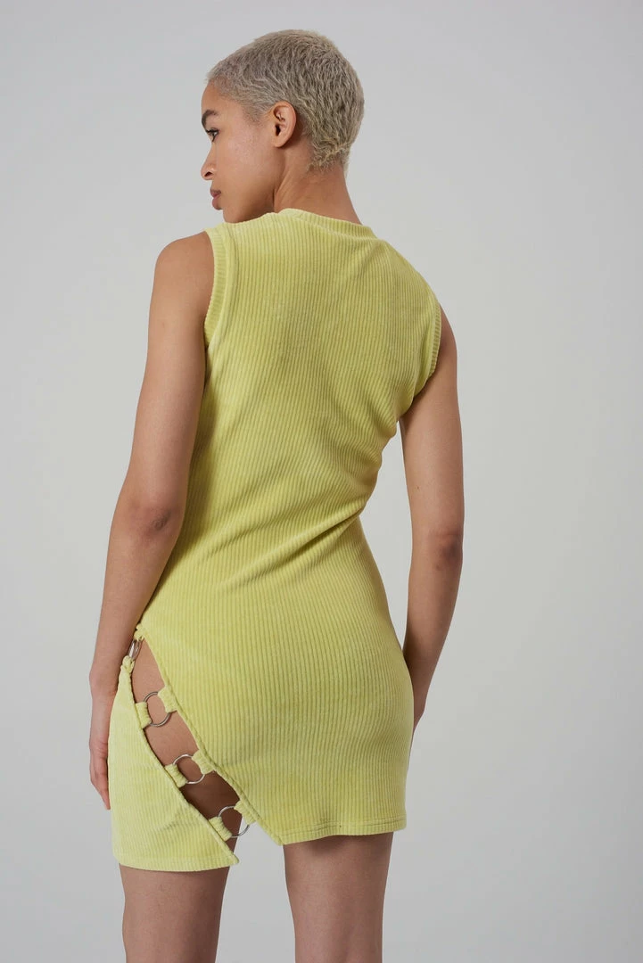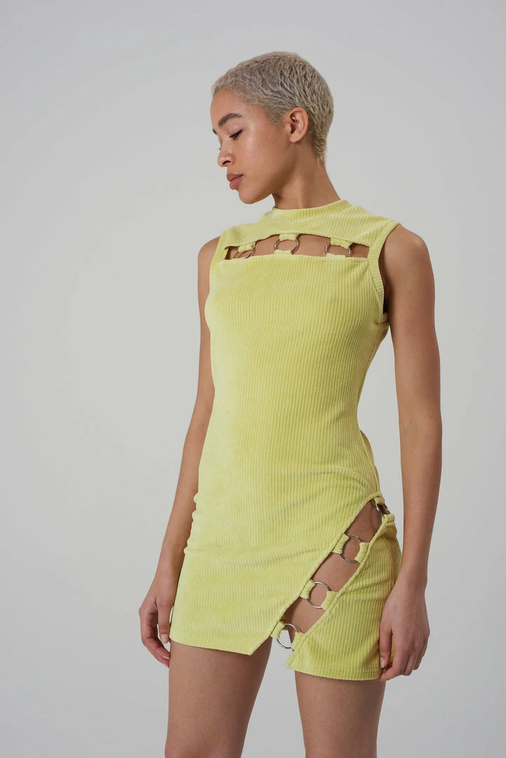 The Ragged Priest green velour mini dress with o-ring cut out detail.