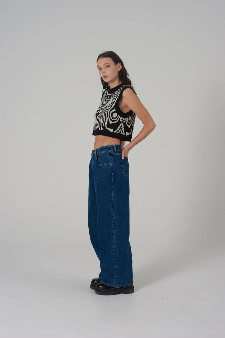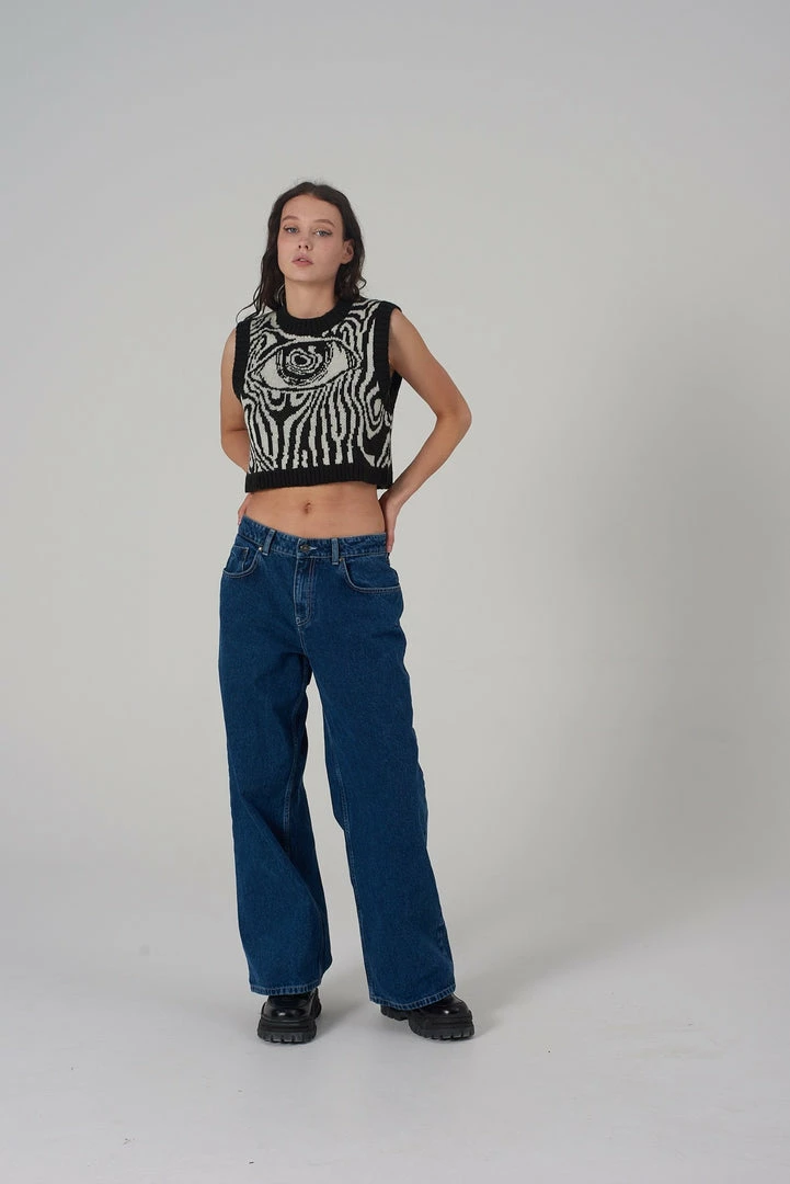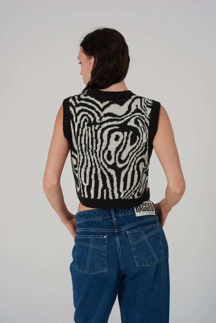 The Ragged Priest black & white marble pattern knitted vest with eye graphic.