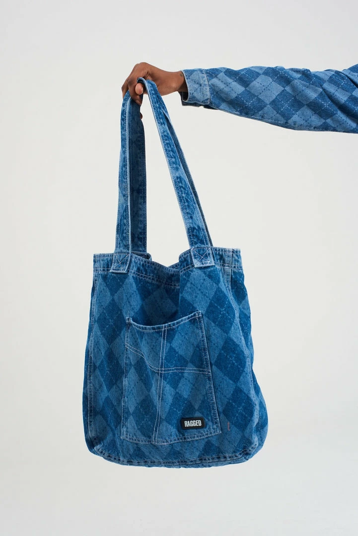 Ragged Jeans laser printed argyle blue denim tote bag.