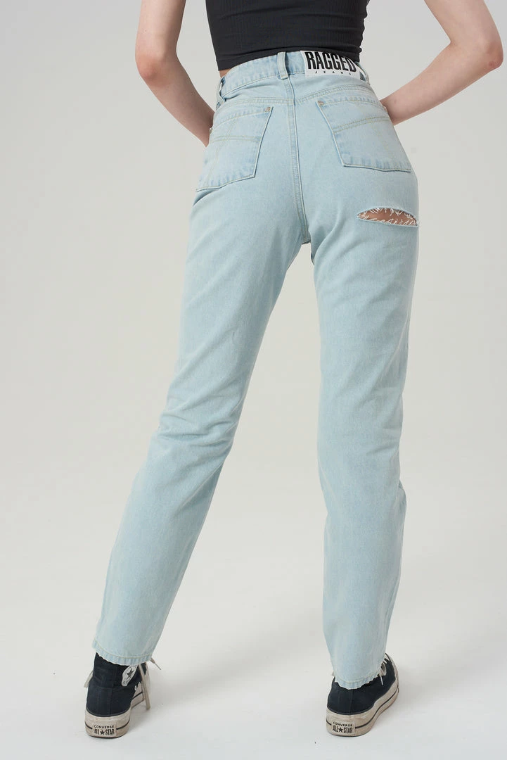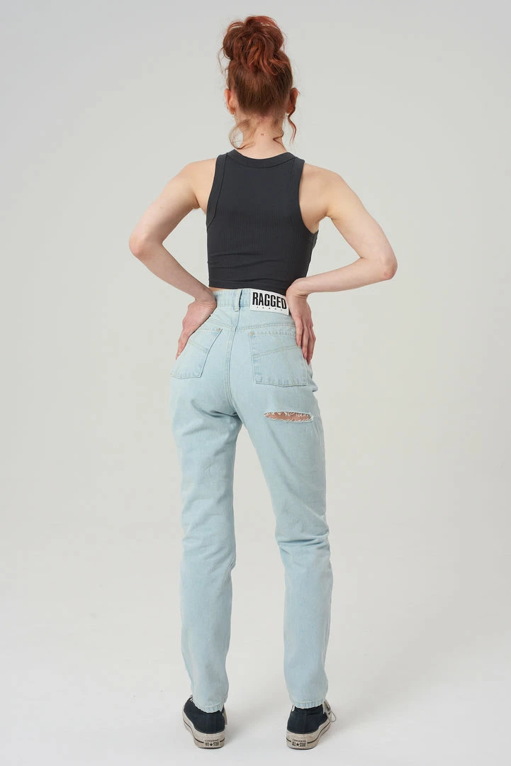 Give your booty the spotlight it deserves. Classic high waisted stonewash mom jeans with rip detail. Classic high waisted mom jean with rip detail. Complete with “RAGGED JEANS” back belt loop tab.