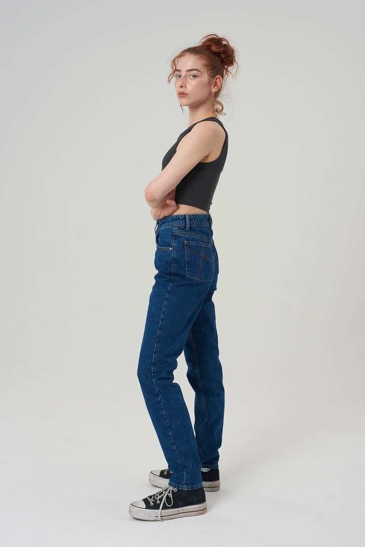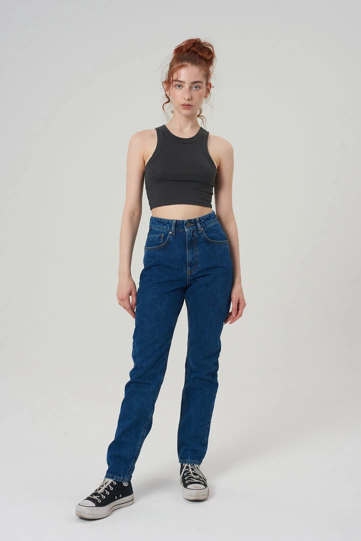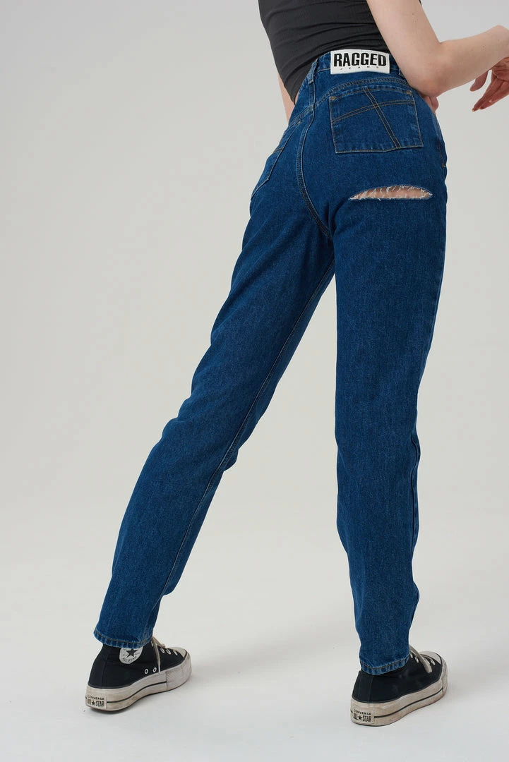 Give your booty the spotlight it deserves. Classic high waisted indigo mom jeans with rip detail. Complete with “RAGGED JEANS” back belt loop tab.
