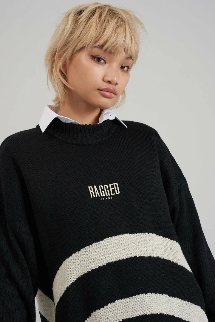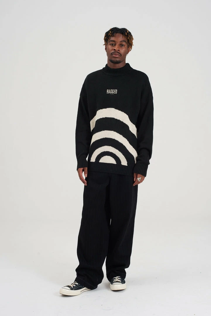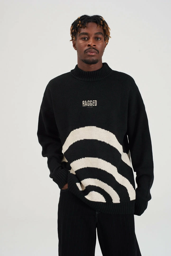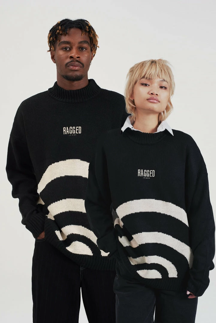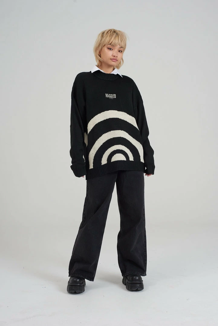 Ragged Jeans unisex black knit jumper with cream circle detail.