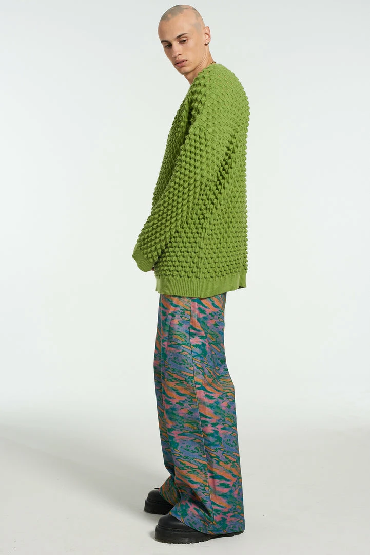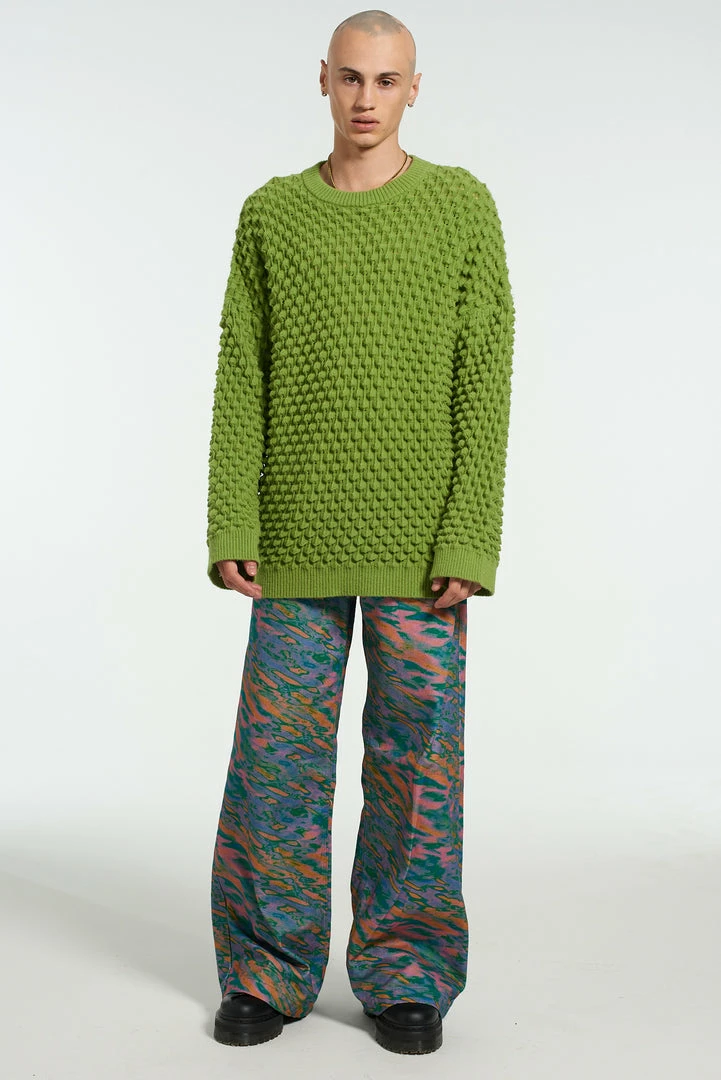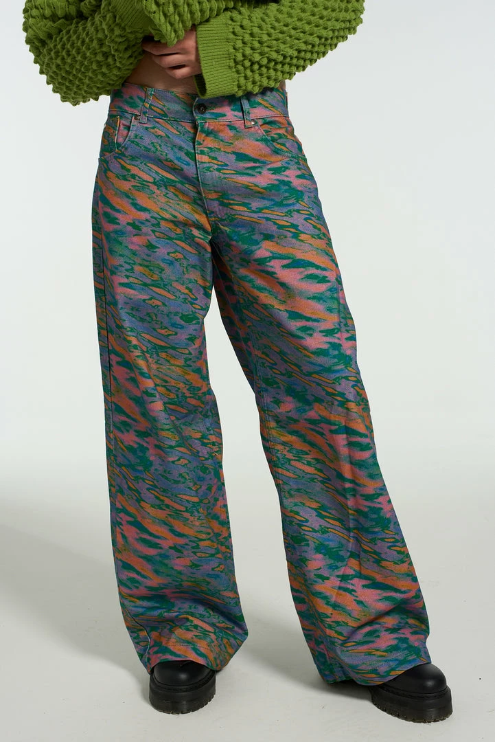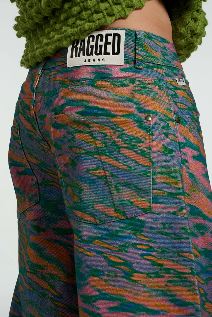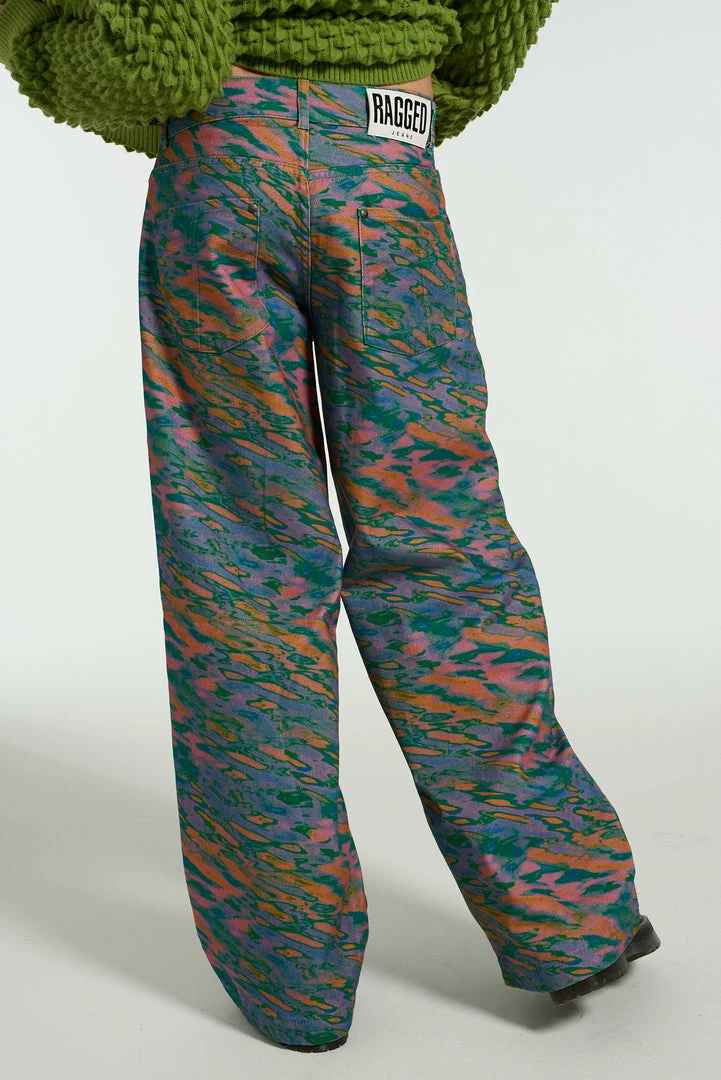 The Ragged Priest men’s wide leg jeans with graphic multi coloured water print design.