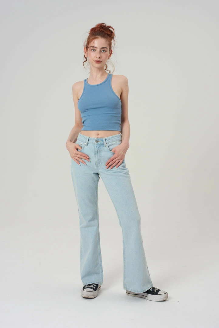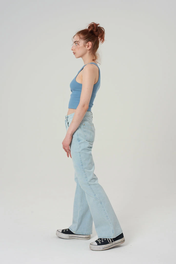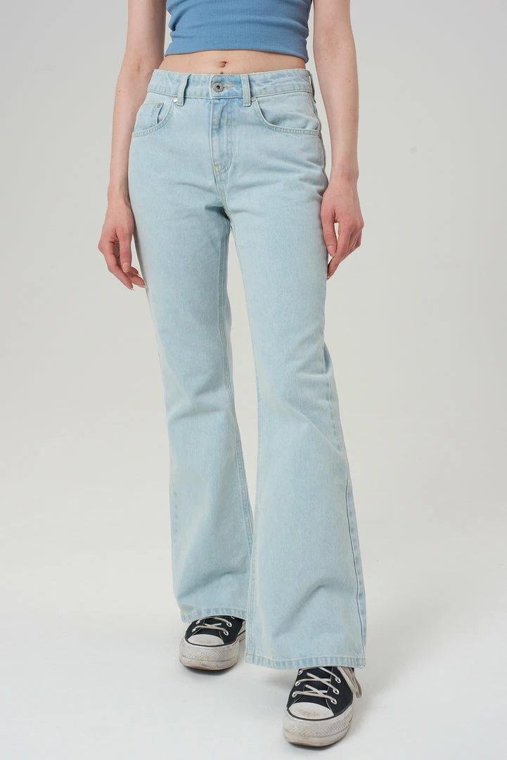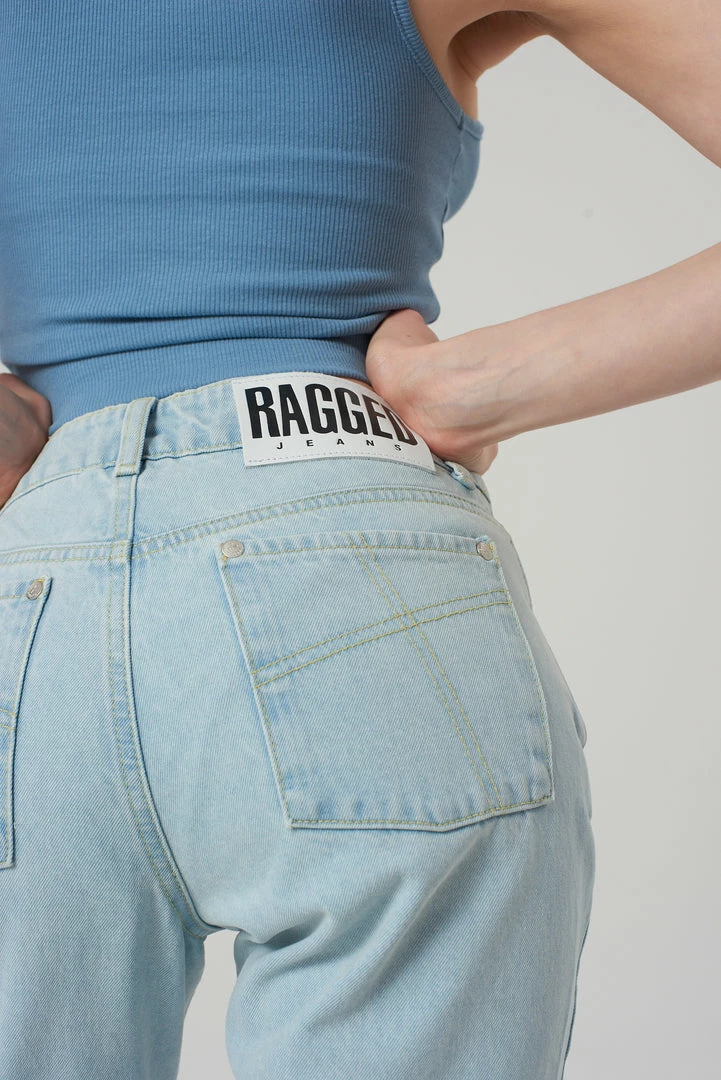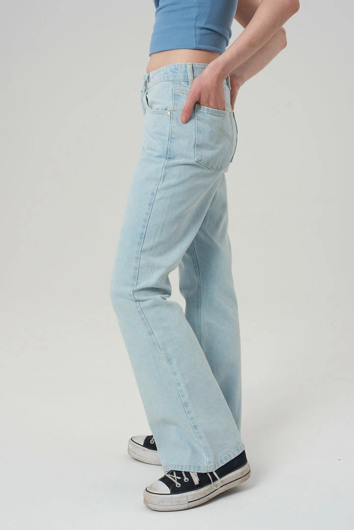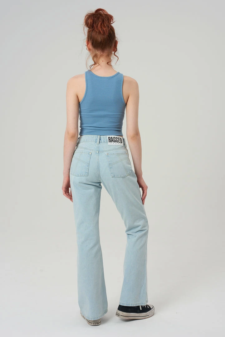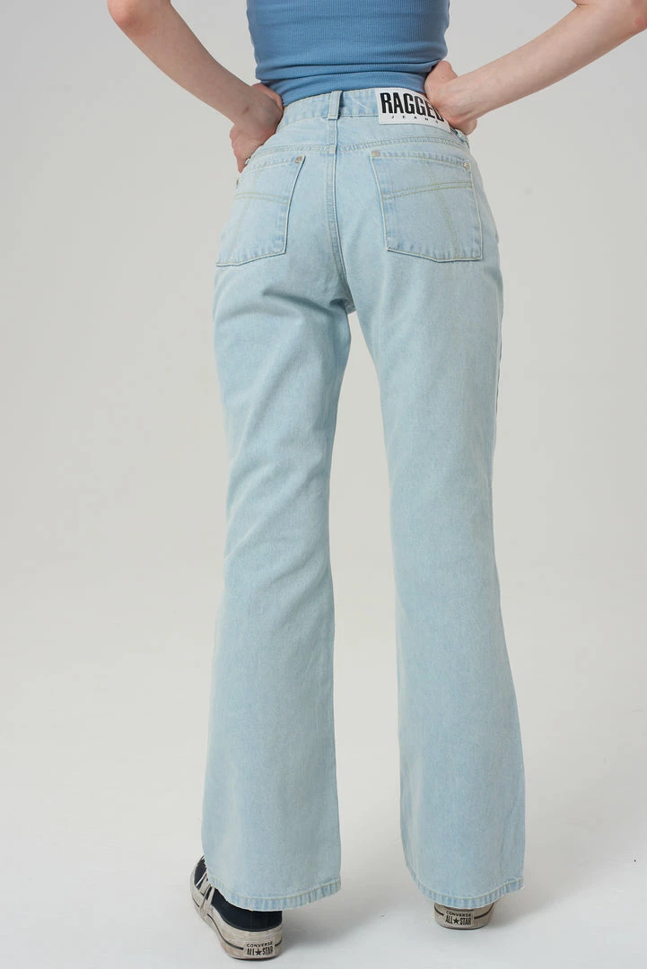The Ragged Priest signature Dakota Jean bootcut jean fit in our light blue stonewash denim with classic “Ragged Jeans” belt loop back tab.