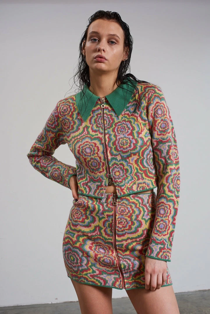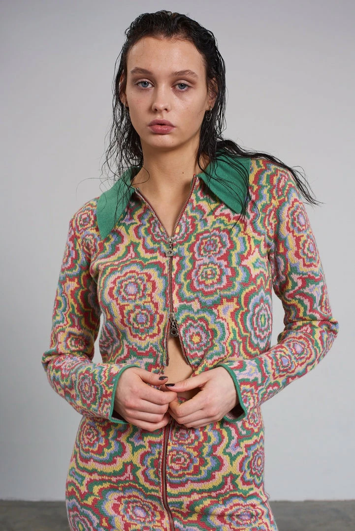 The Ragged Priest multi colour trippy floral jacquard long sleeve knitted top / cardigan with zip front and contrast collar.