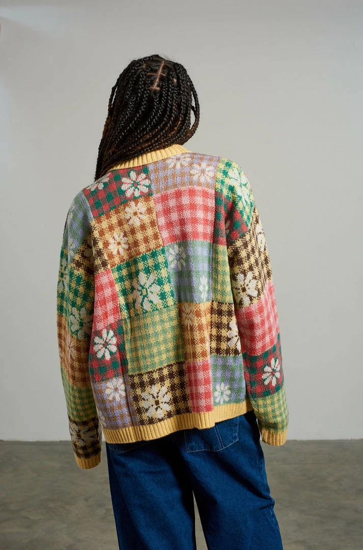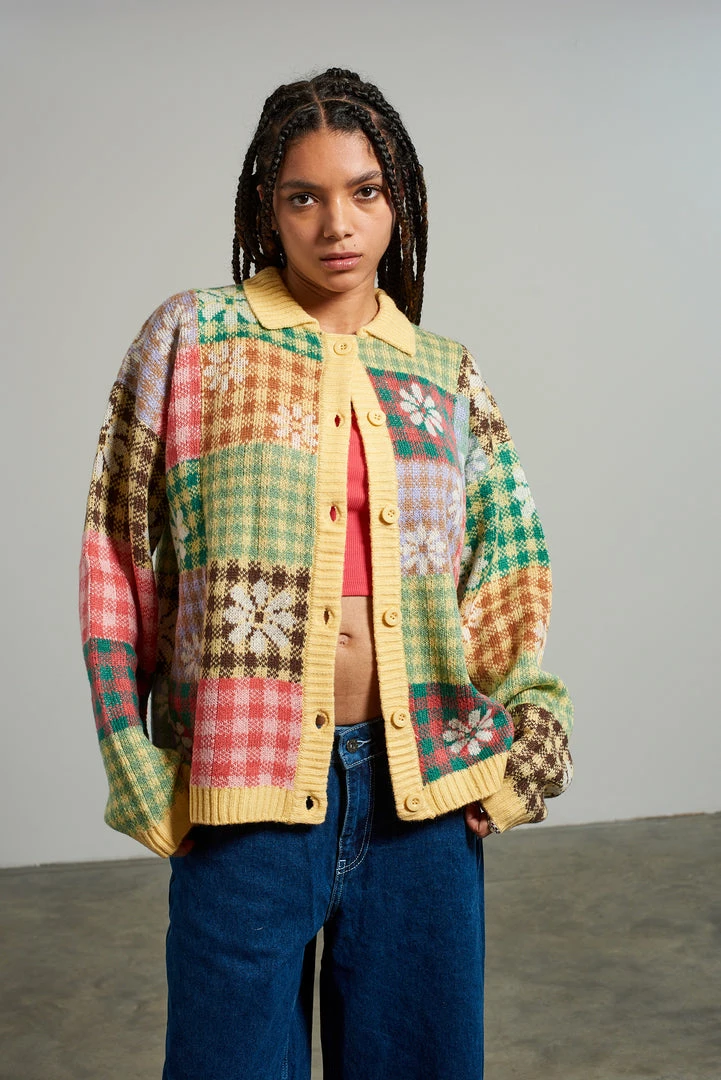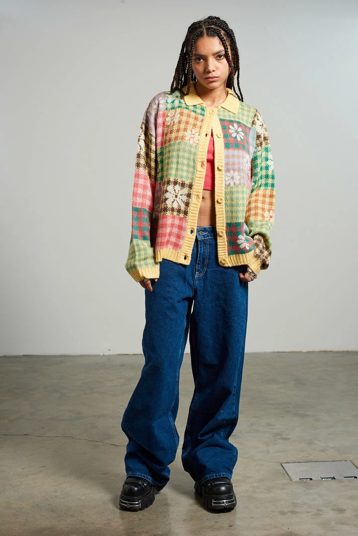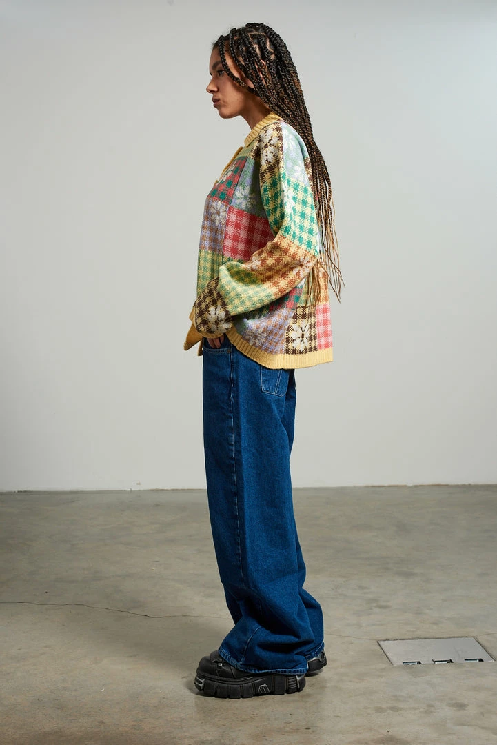 The Ragged Priest mixed patchwork panelled knitted button up oversized jacket.