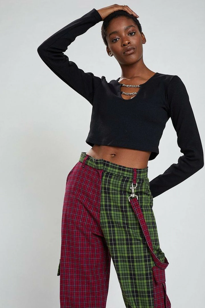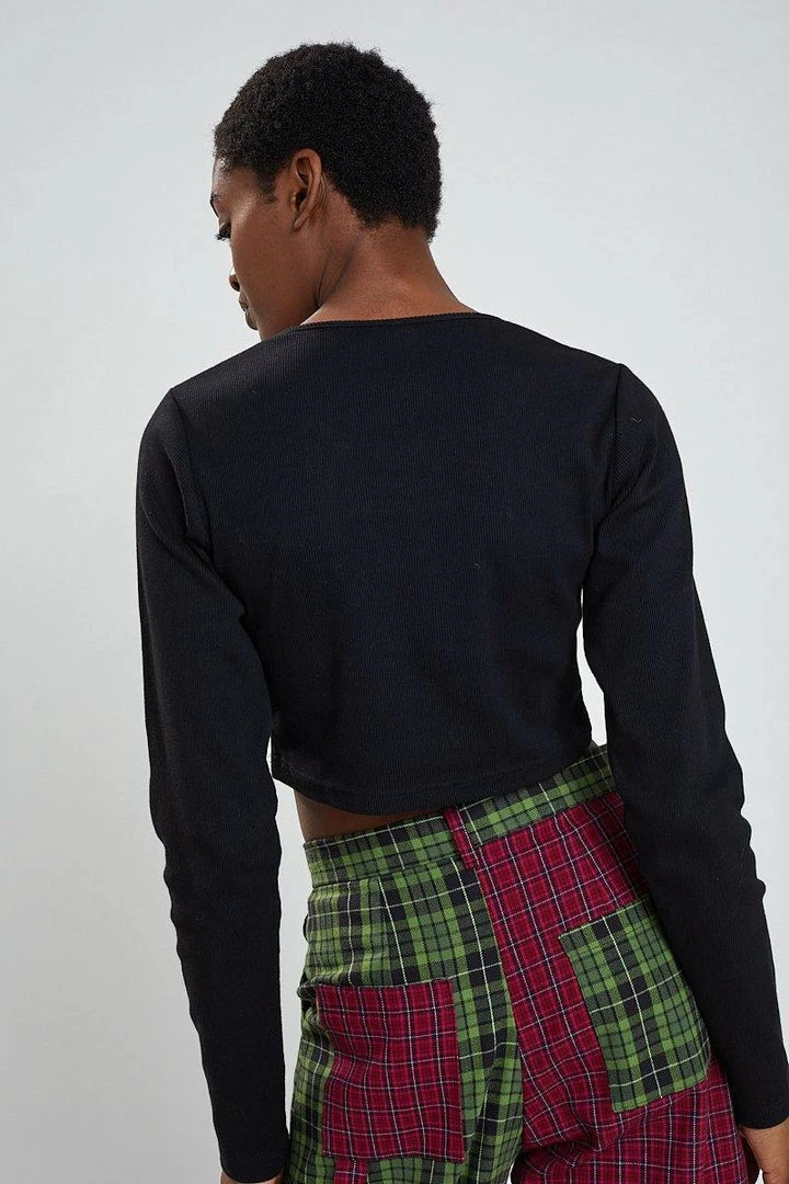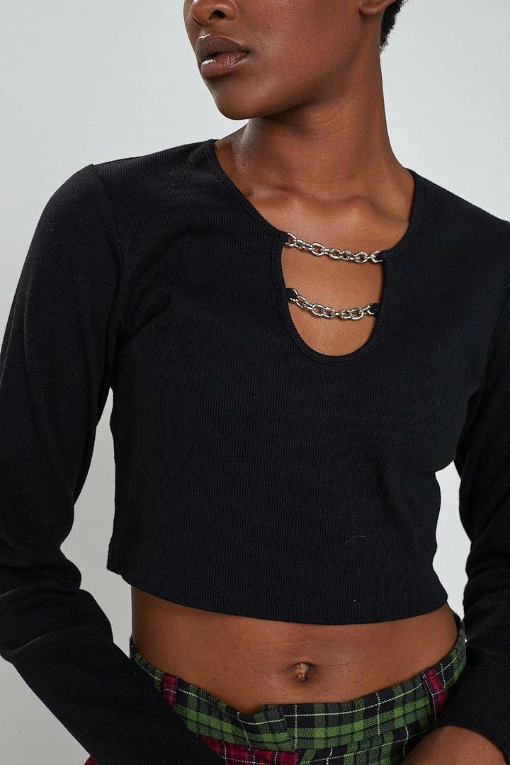 The Ragged Priest black ribbed long sleeve top with chain strap chest detail.