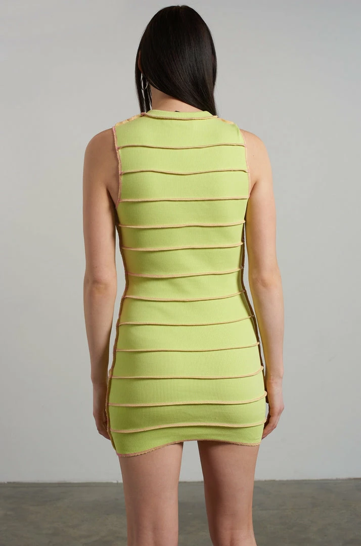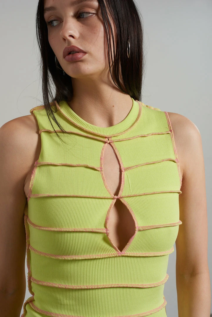 The Ragged Priest sleeveless mini dress with cut out detail and exposed overlock panelling.