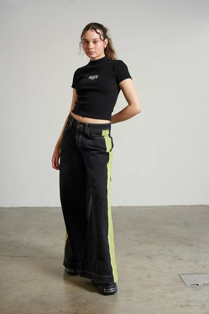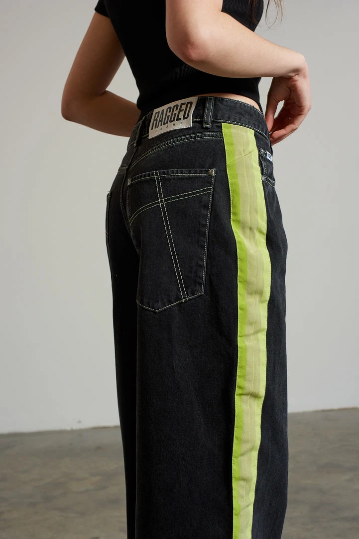 Ragged Jeans charcoal wide leg denim skater jean with side seam stripe.