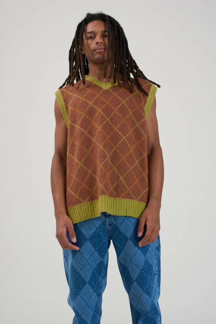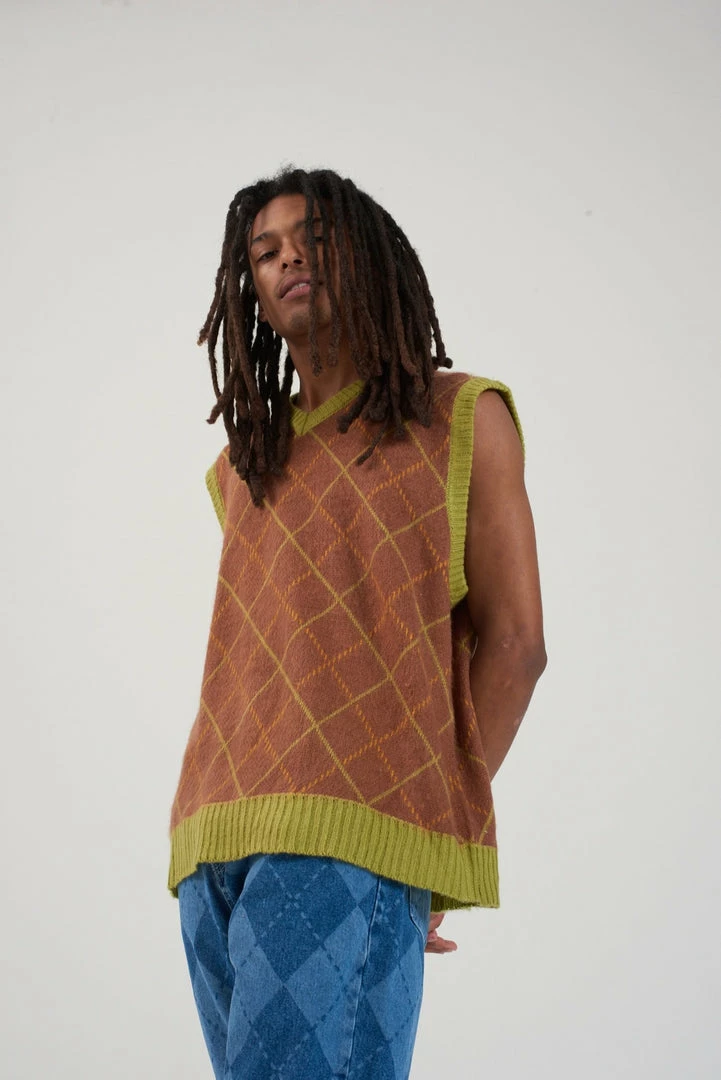 Ragged Jeans mens brown and green knitted v-neck vest.