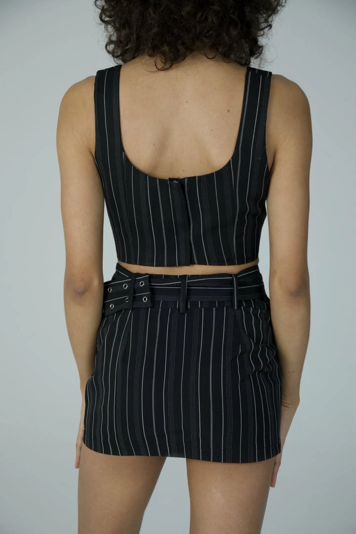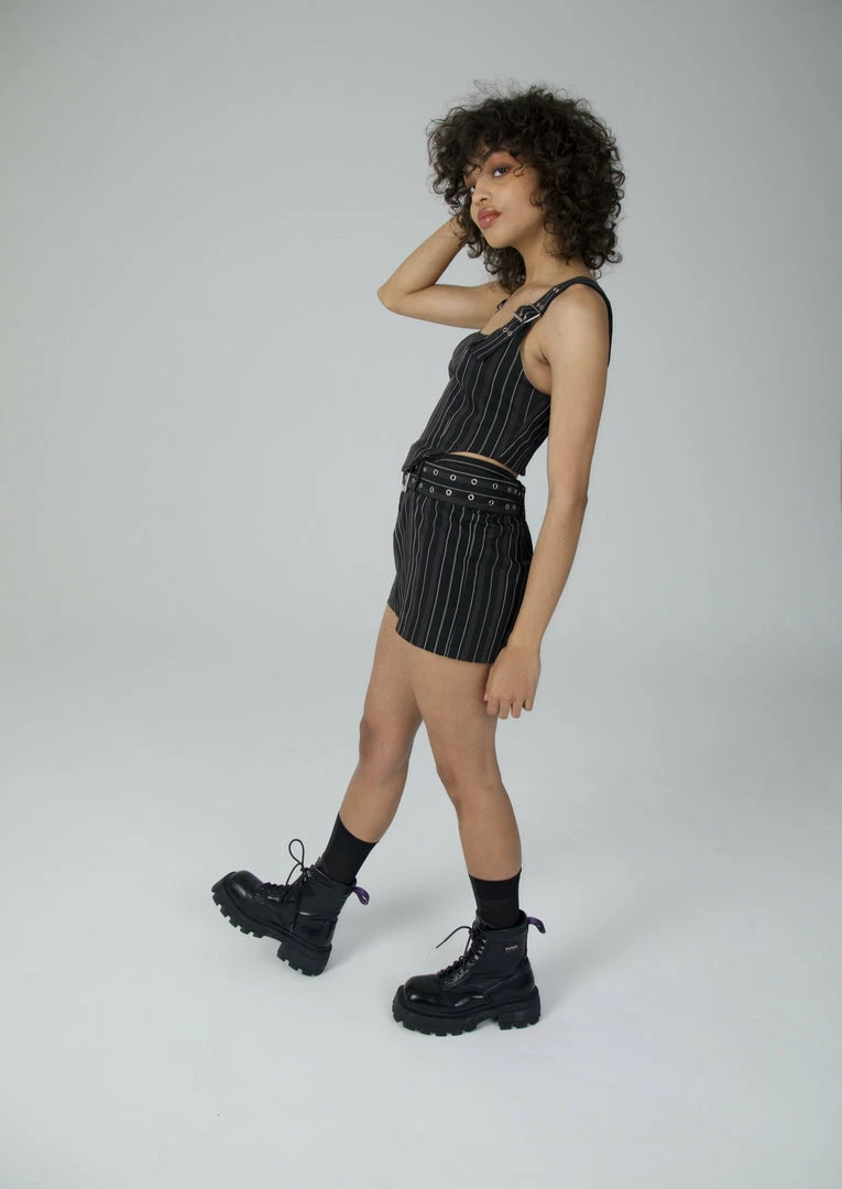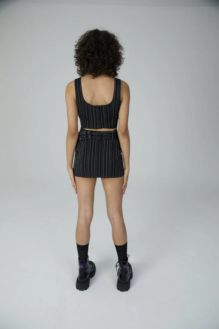 The Ragged Priest black pinstripe mini skirt with double eyelet buckle belt.