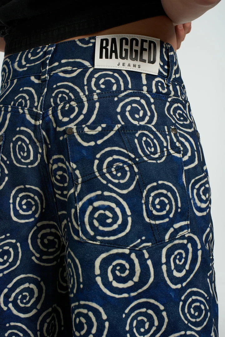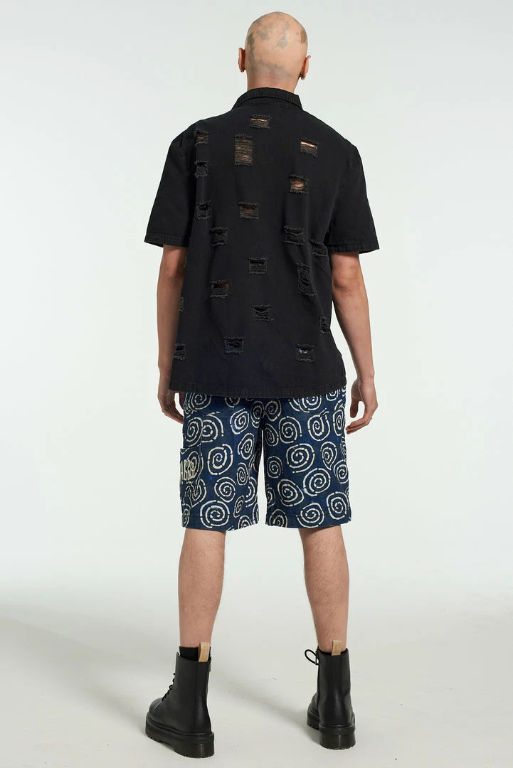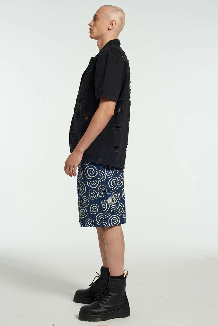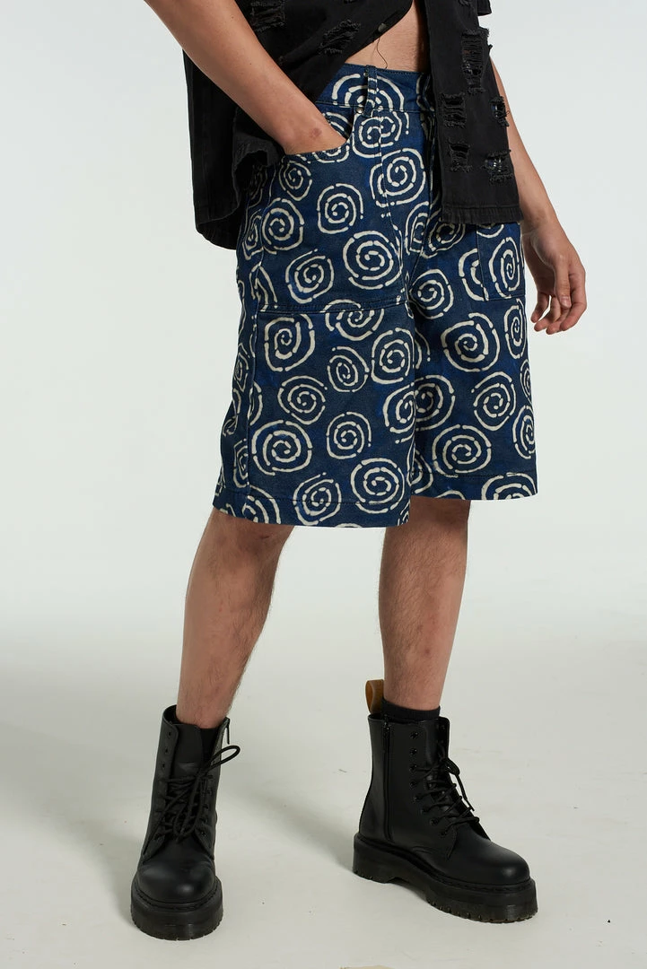 The Ragged Priest men’s Batik inspired swirl print carpenter shorts in navy and white.