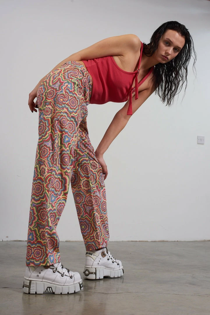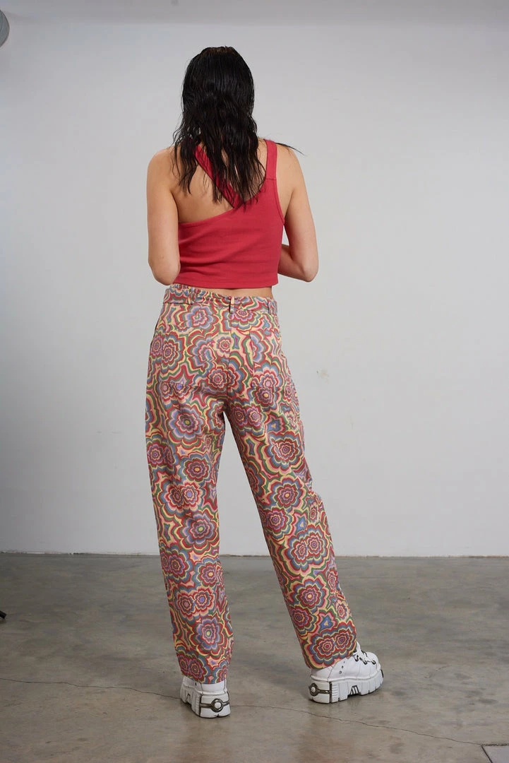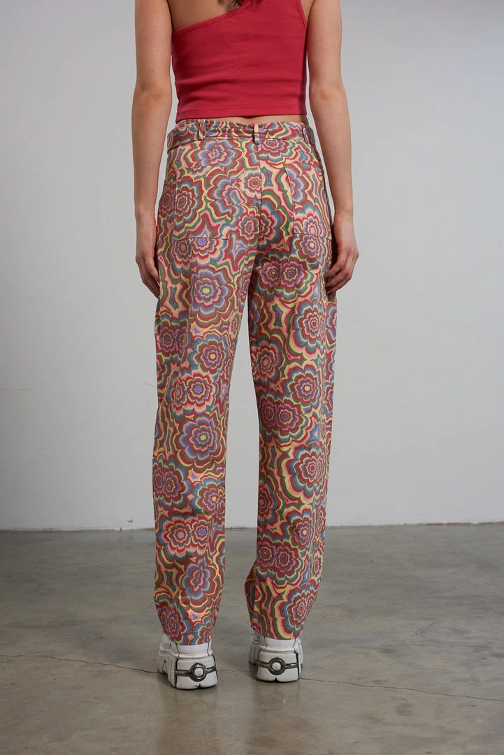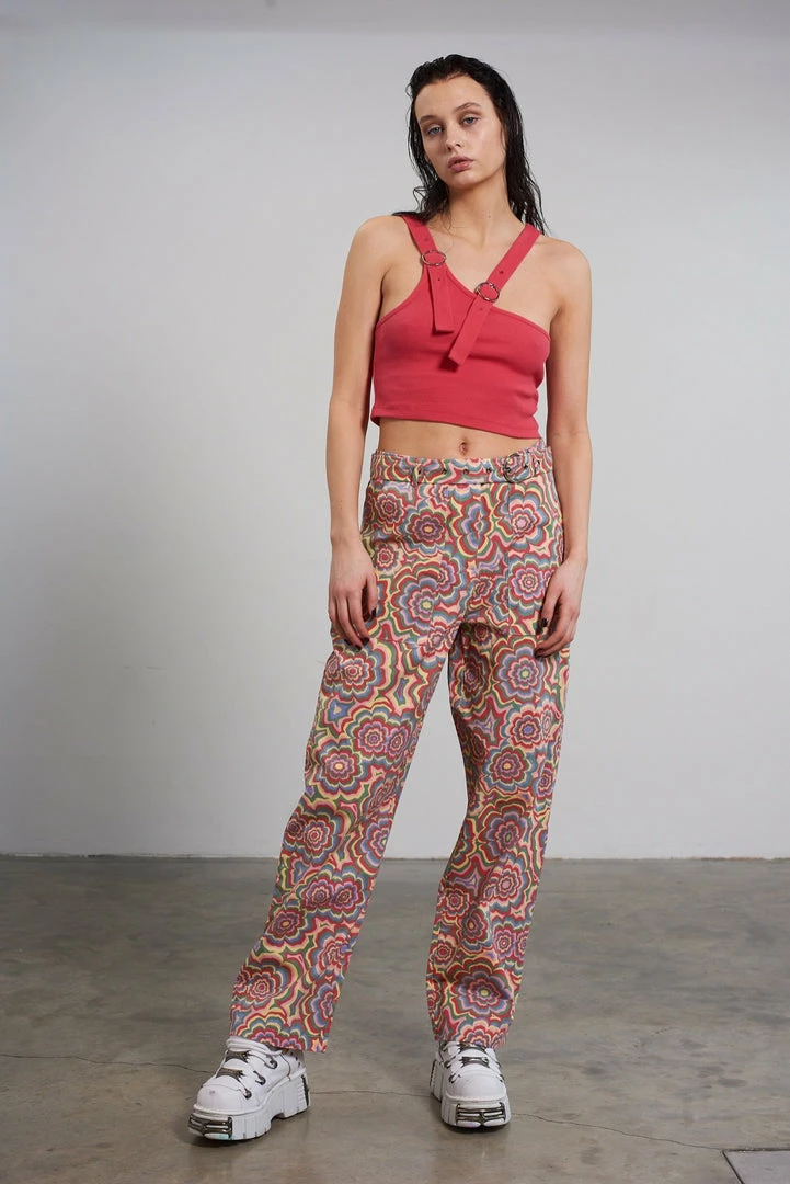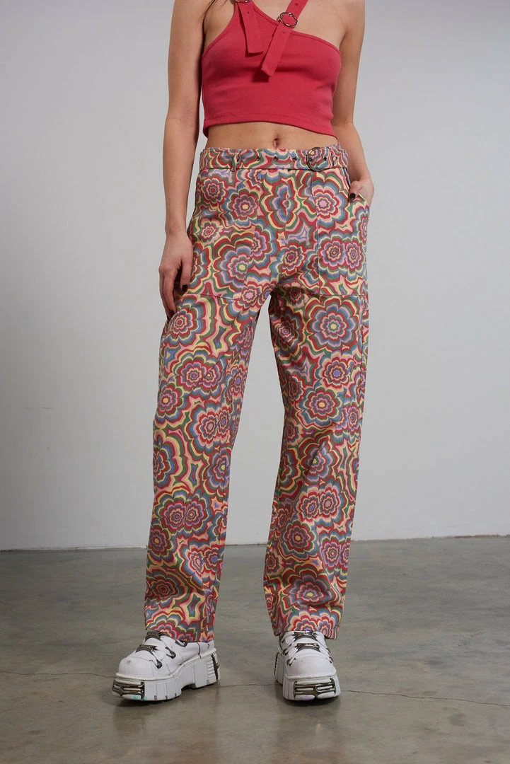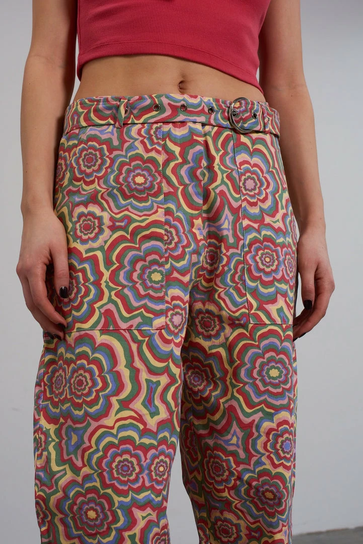 The Ragged Priest multi colour trippy floral print pant with buckle belt detail.