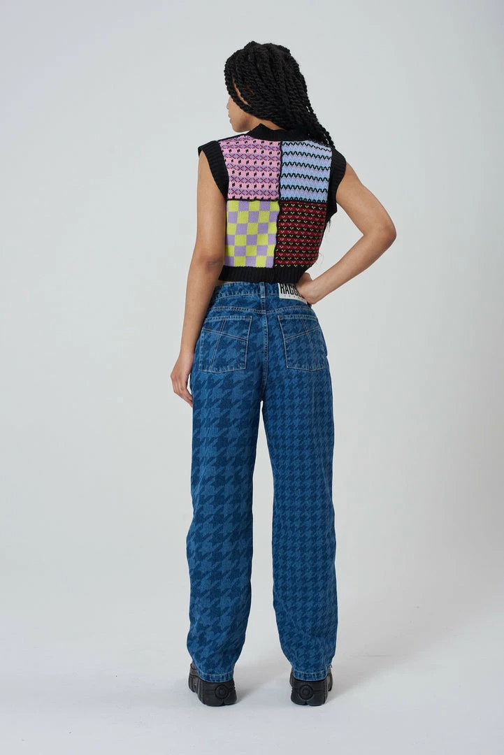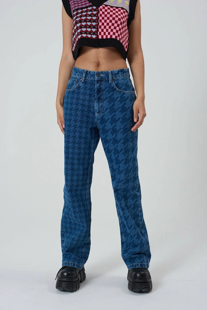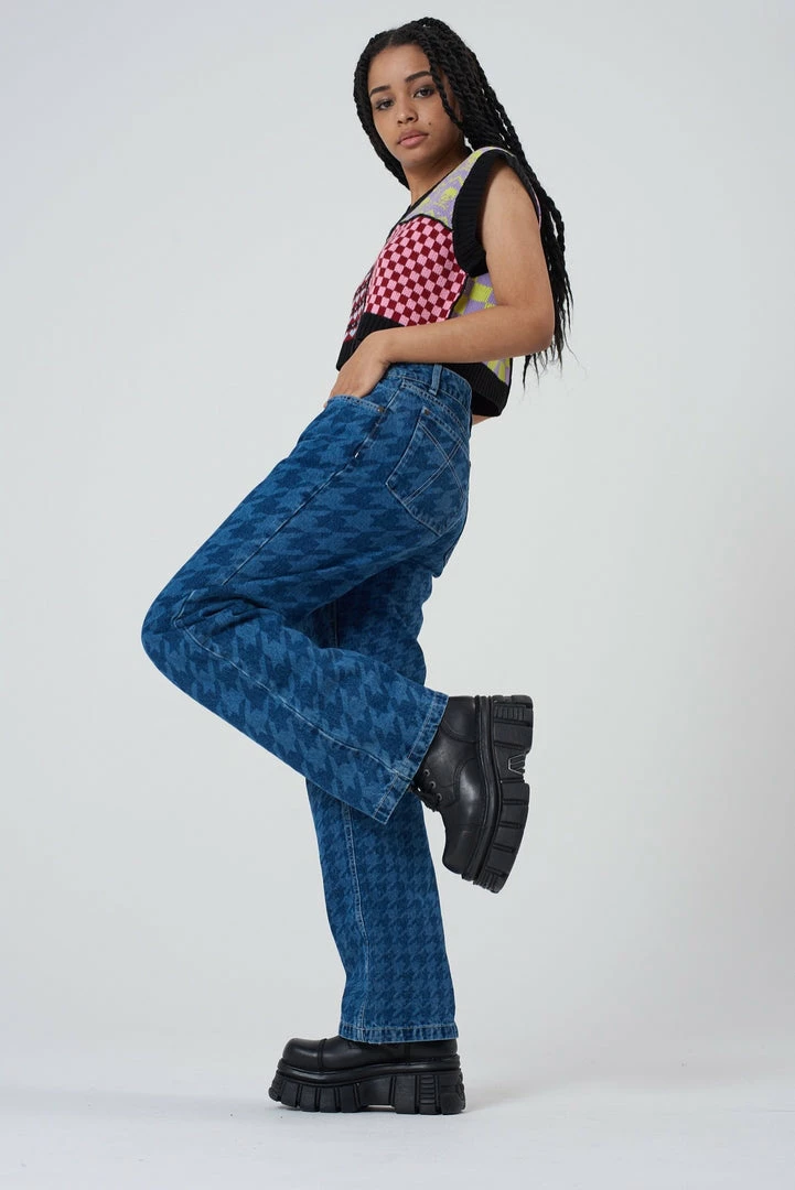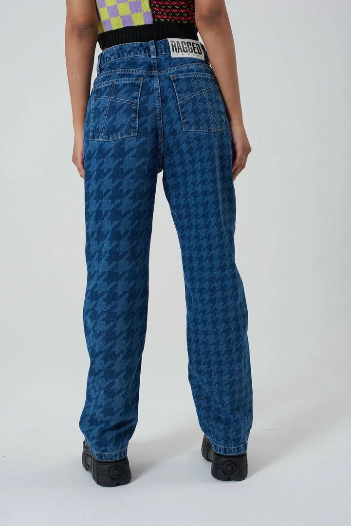 Ragged Jeans houndstooth laser print blue denim dad jean.