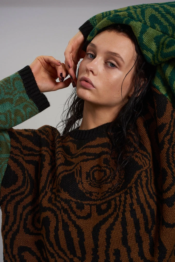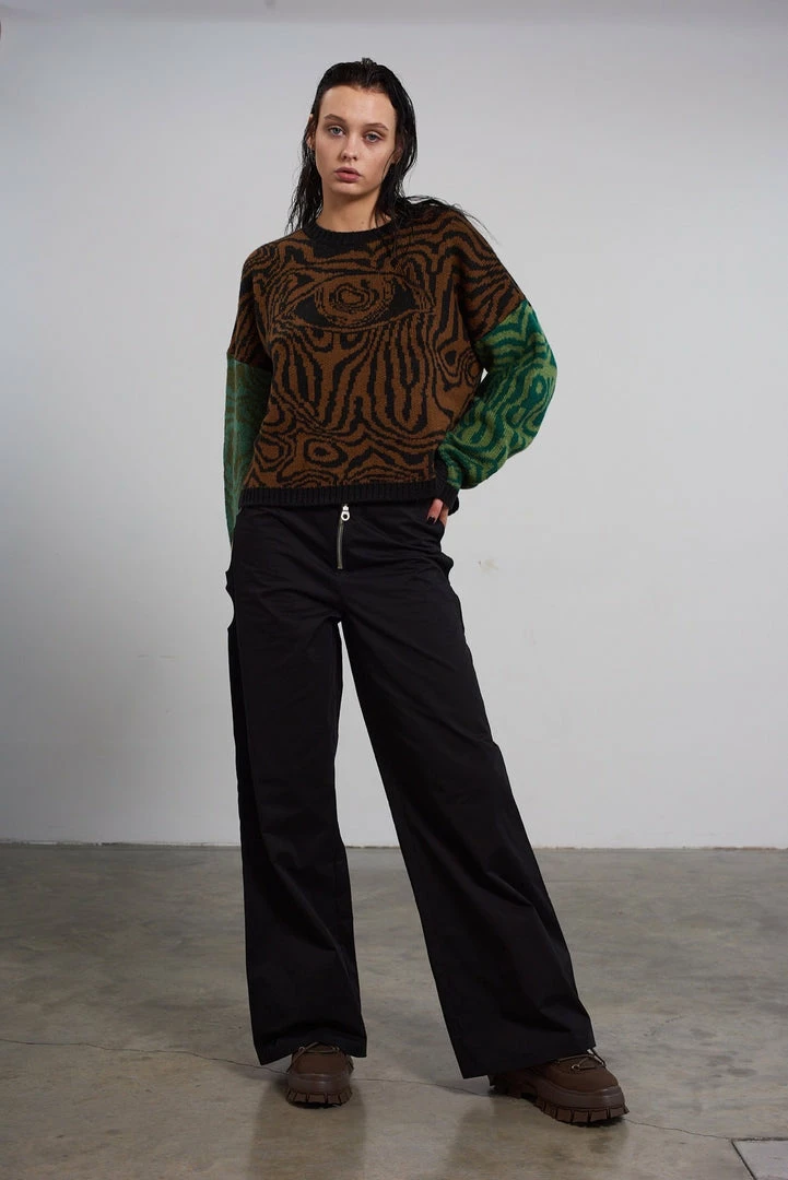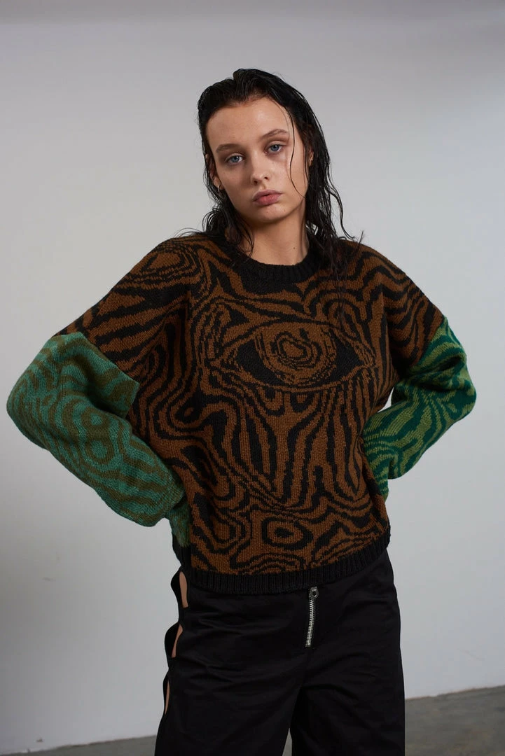 The Ragged Priest brown marble pattern knitted jumper with eye graphic and green contrast sleeves.