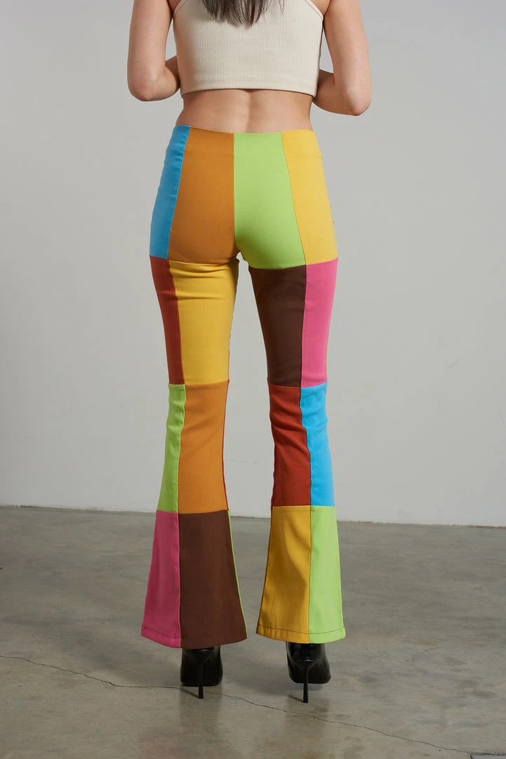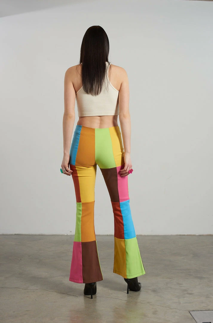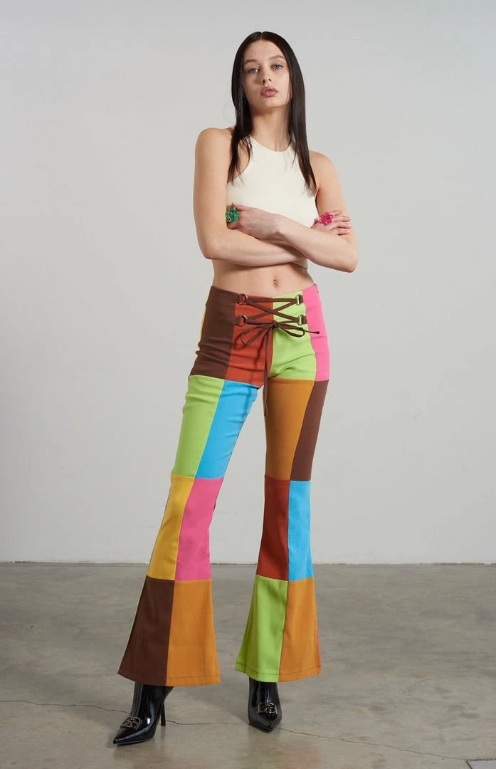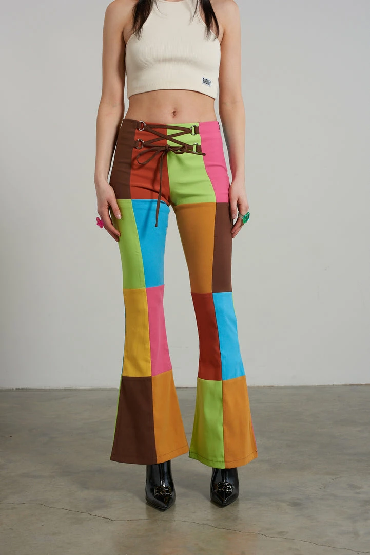 The Ragged Priest multi colour panelled flared pant with d-ring and tie up front.