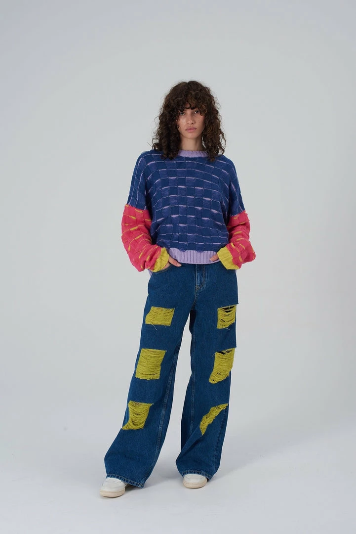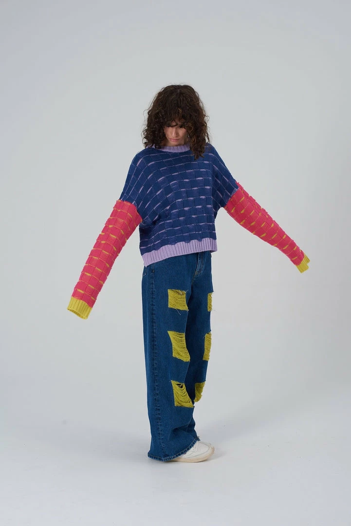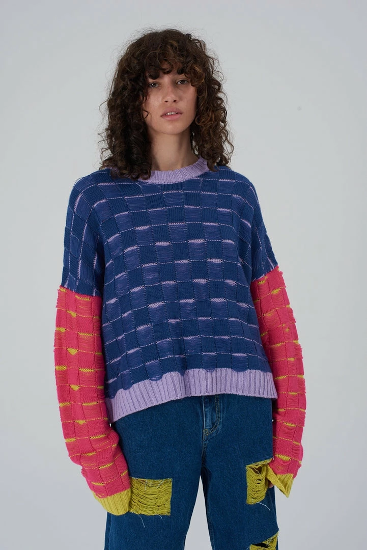 Ragged Jeans purple laddered checkerboard knit jumper.