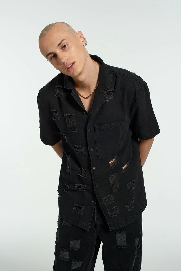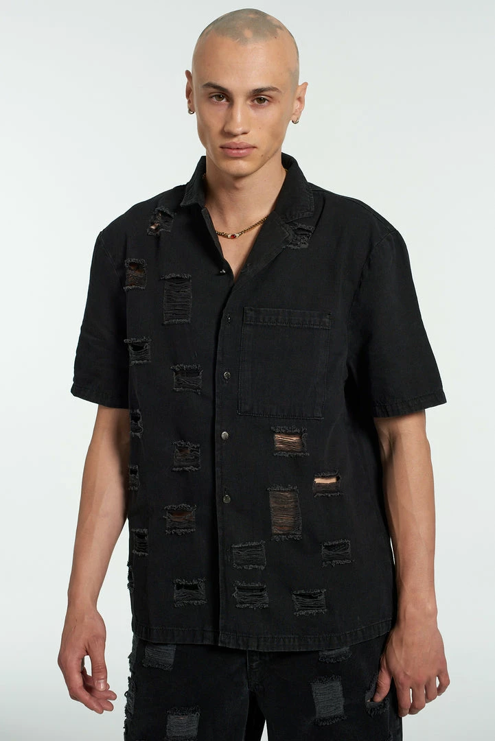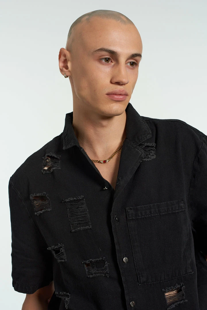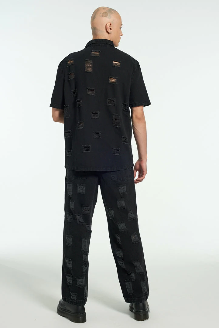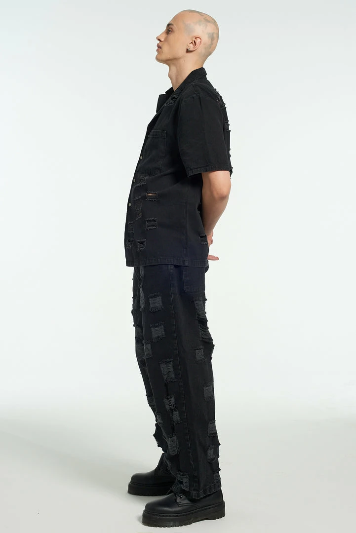 The Ragged Priest men’s charcoal denim shirt with square distressed design.