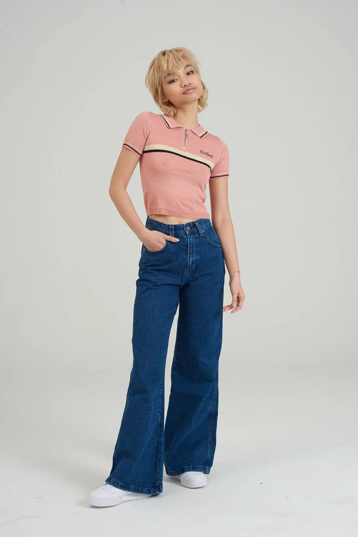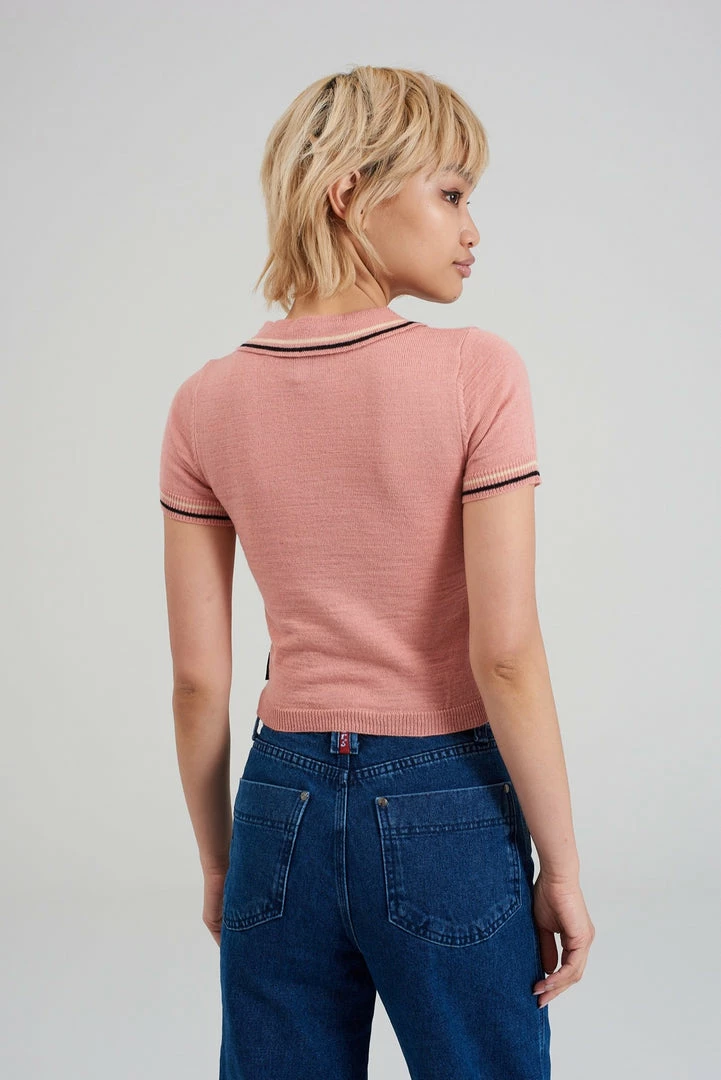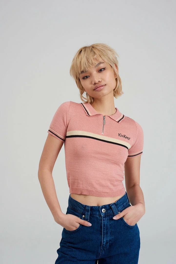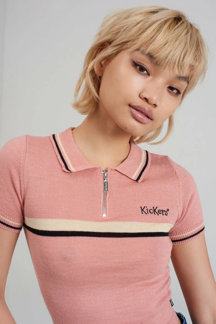 Kickers Classics pink knitted polo top with sports stripe logo.