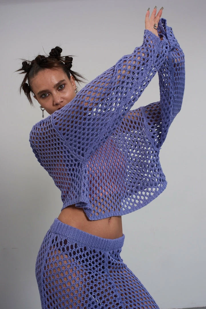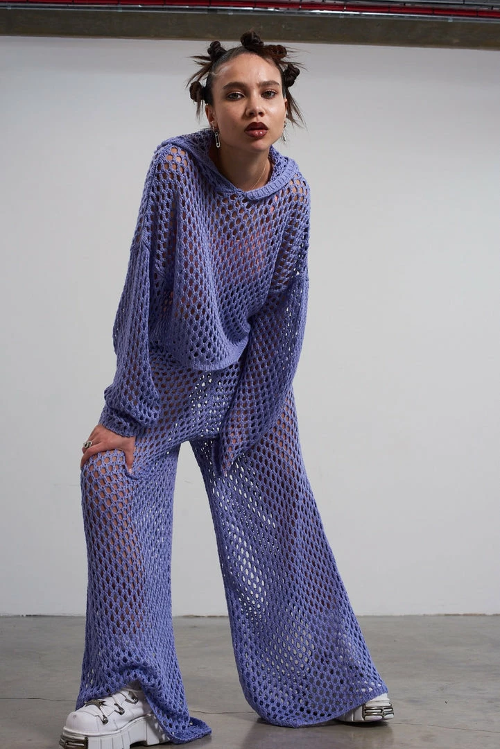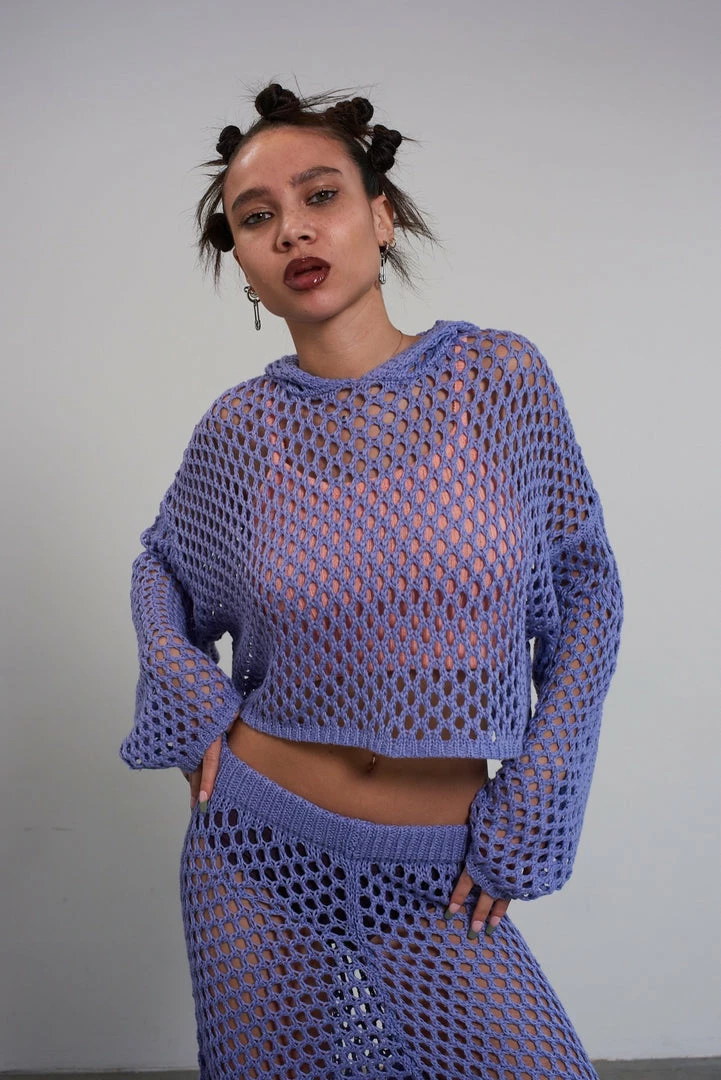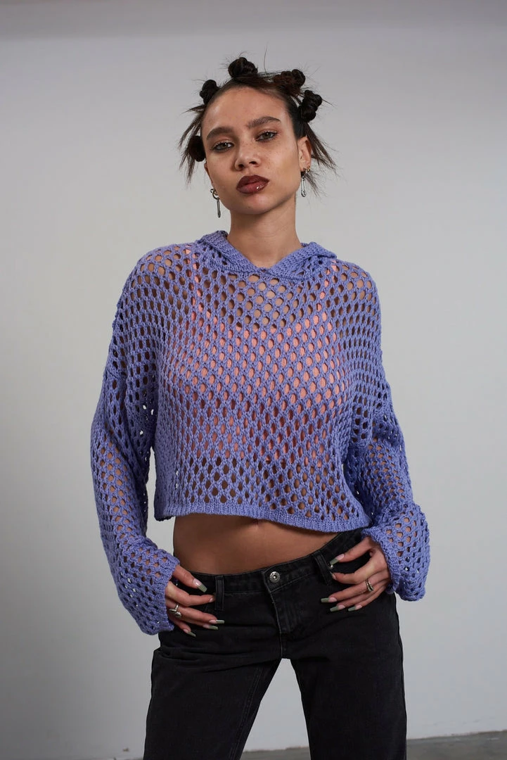 The Ragged Priest purple open knit hoodie with rib knit cami top underlayer.