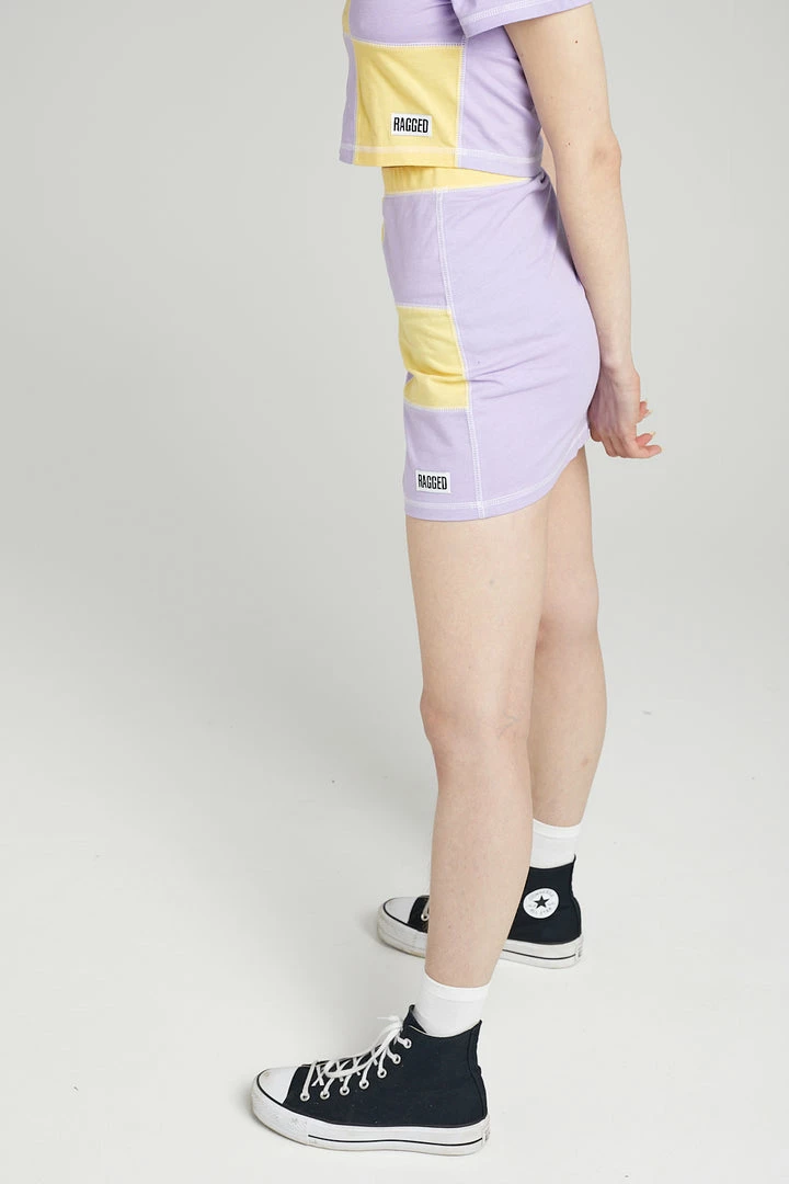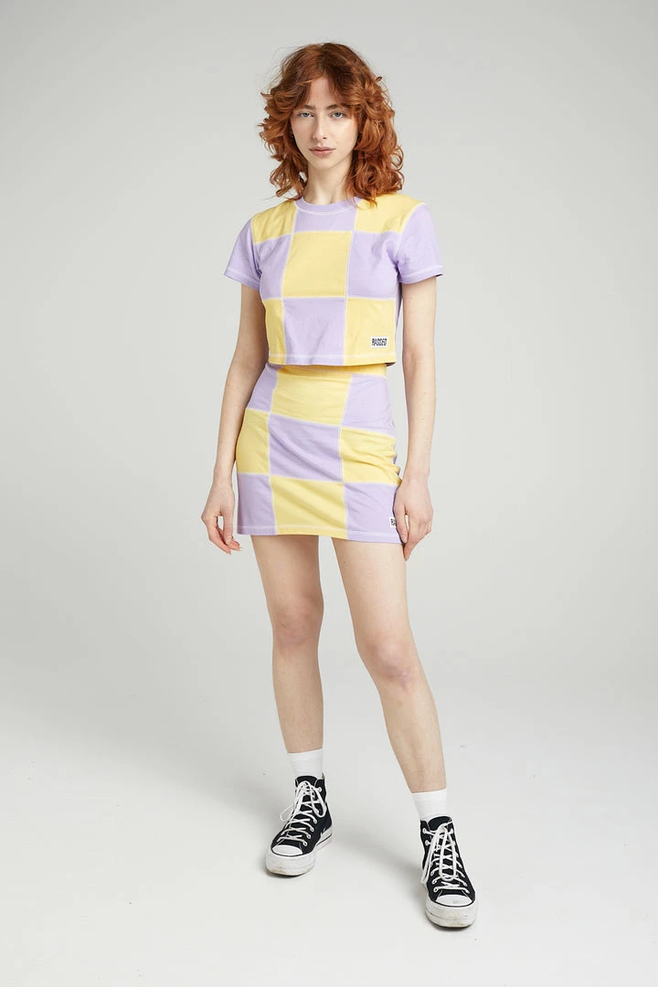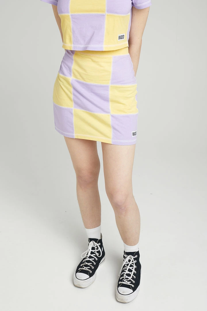 Ragged Jeans yellow & purple checkerboard jersey mini skirt.