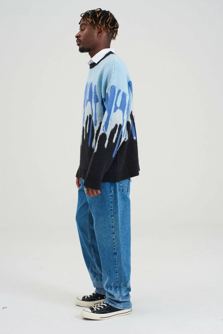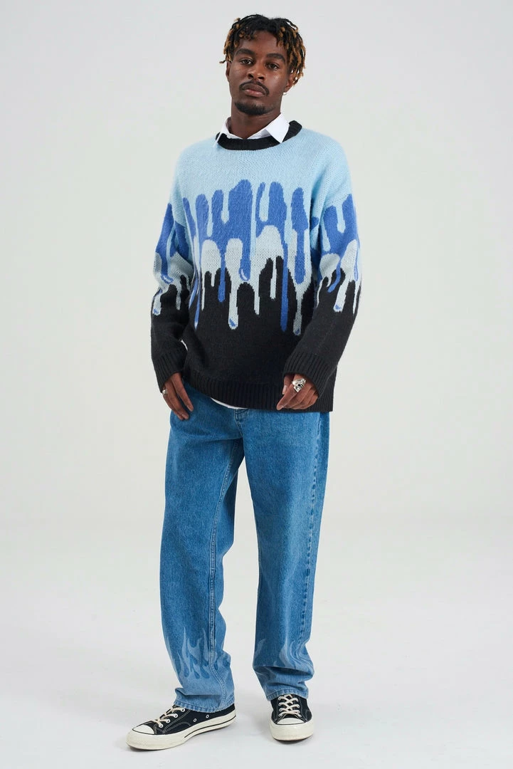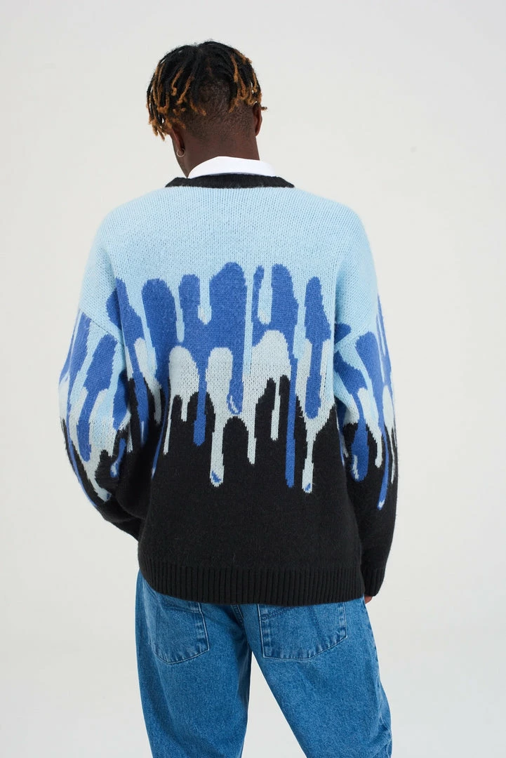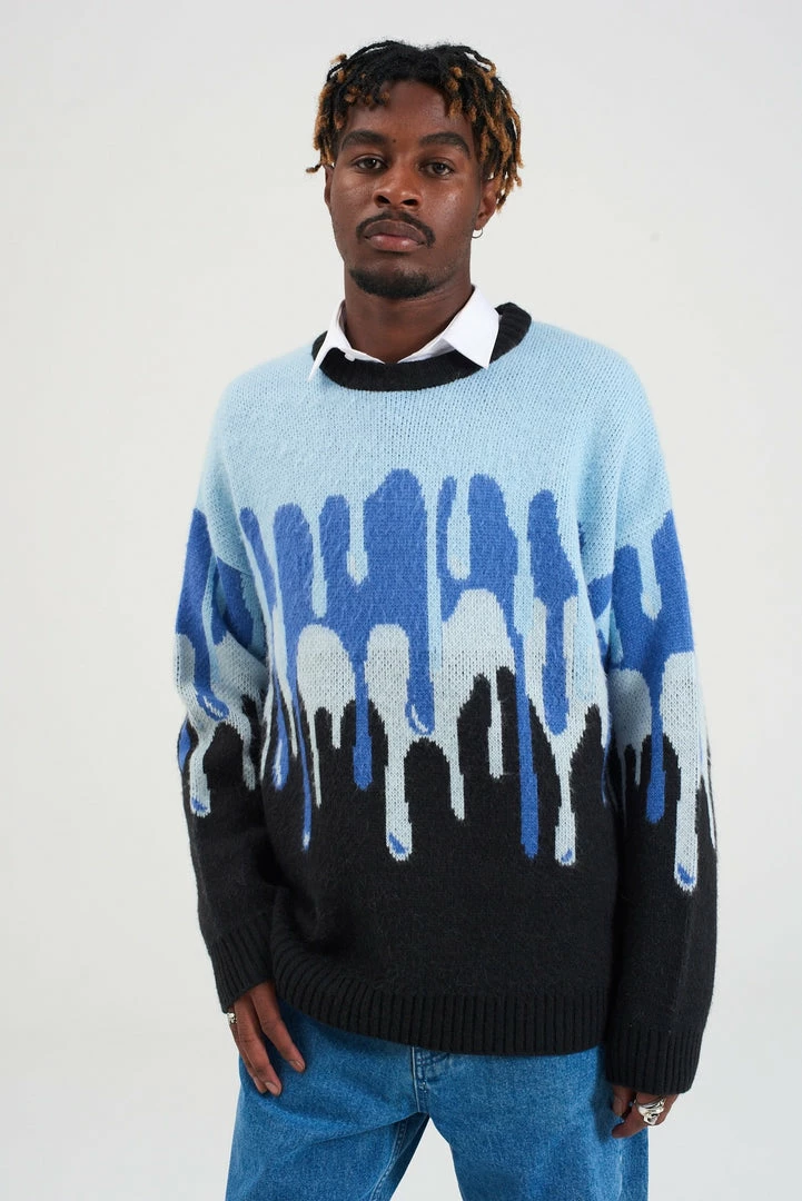 Ragged Jeans mens black knit jumper with blue drip pattern.