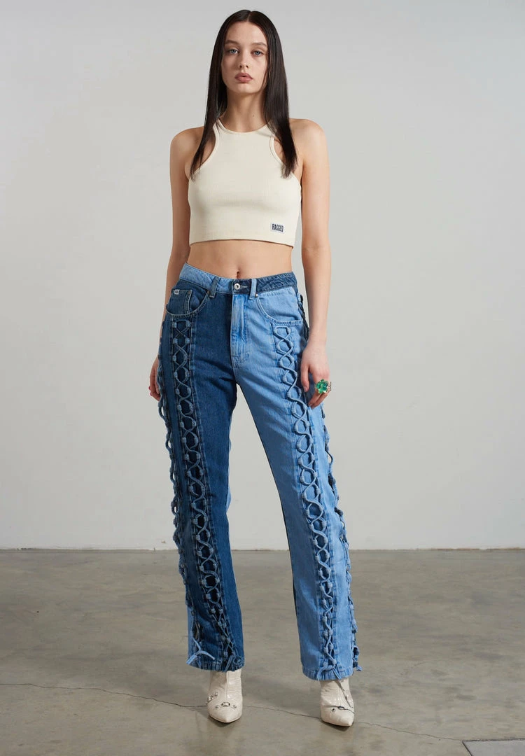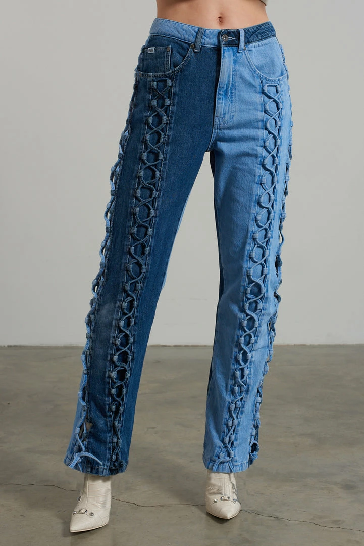 Ragged Jeans half and half blue denim dad jean with lace-up detail.