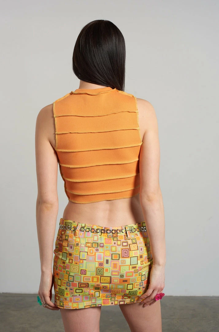 The Ragged Priest orange sleeveless top with cut out detail and exposed overlock panelling.