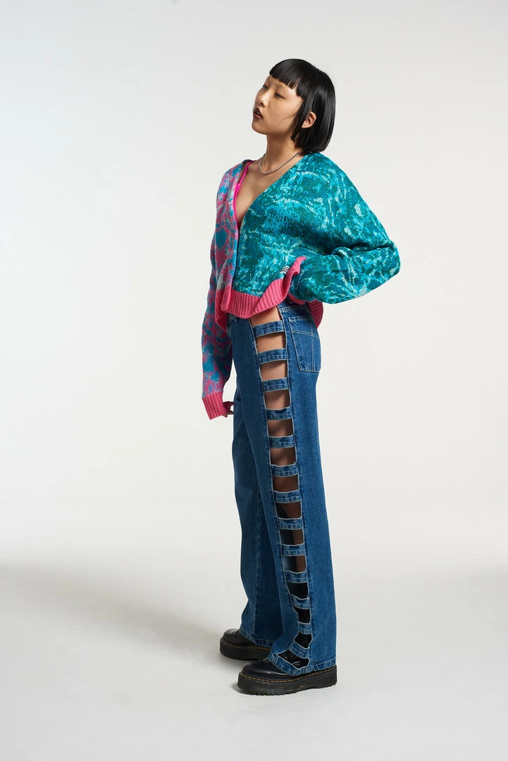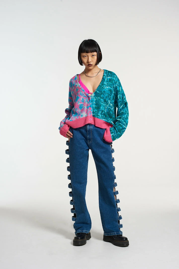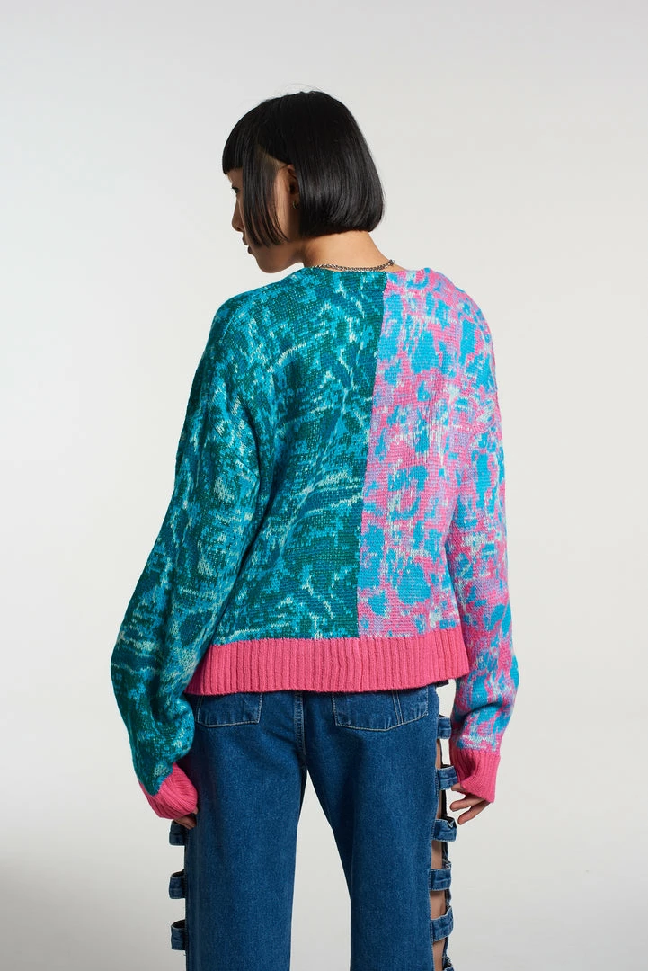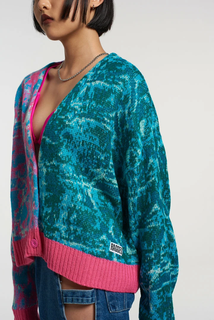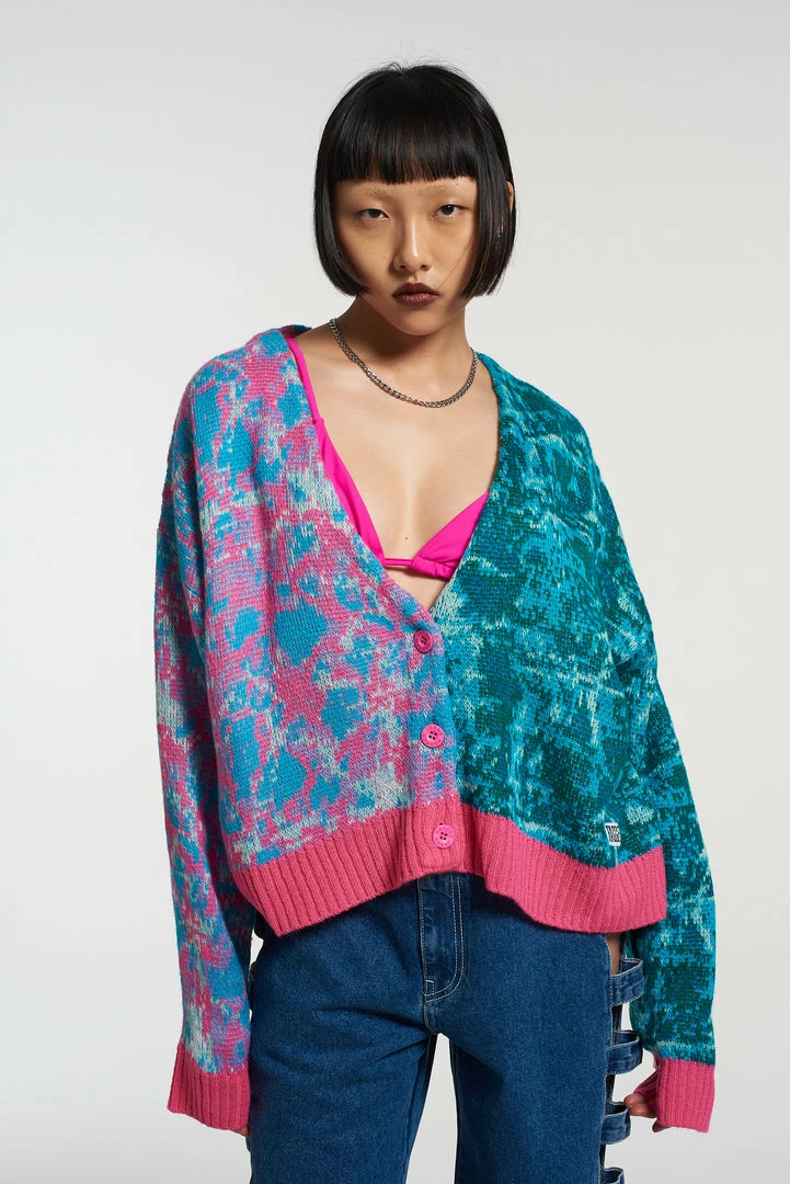 The Ragged Priest Pink and blue spliced water print knitted cardigan with half and half design, V neck and button up front.