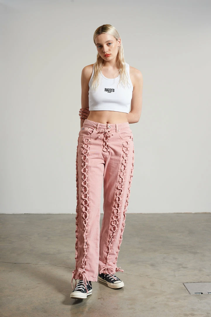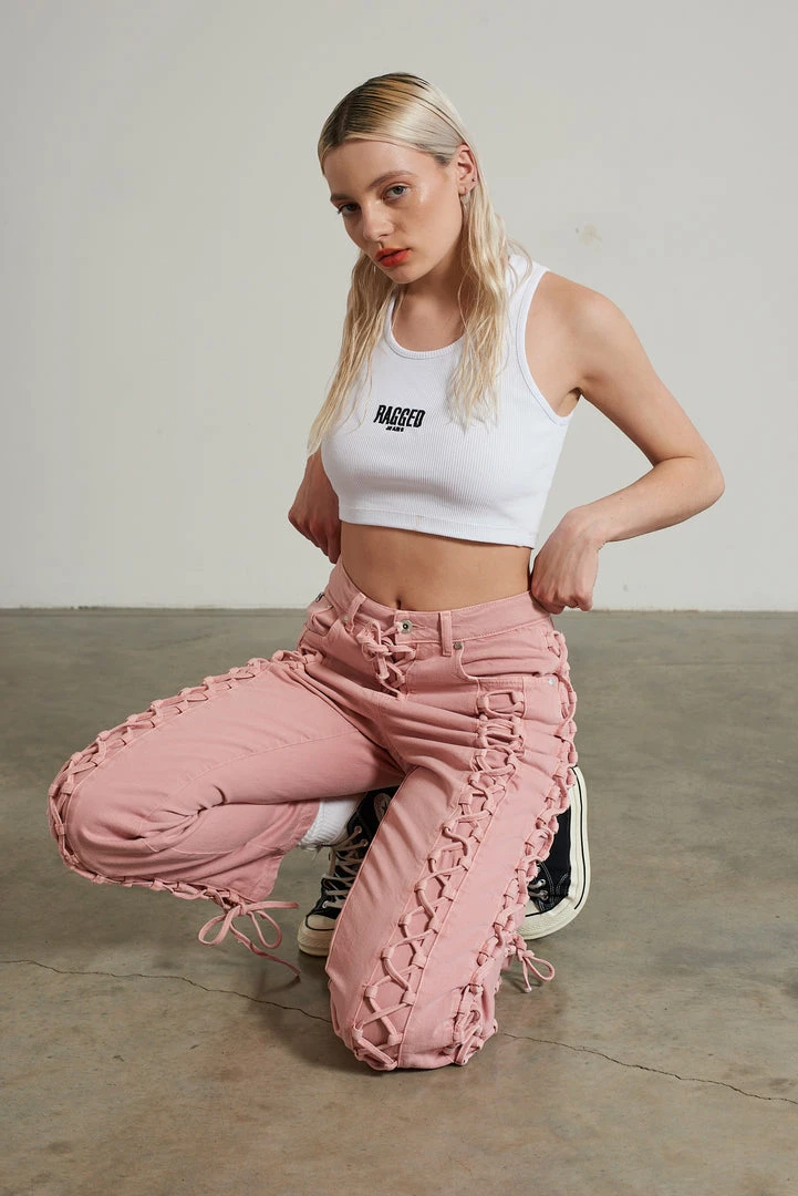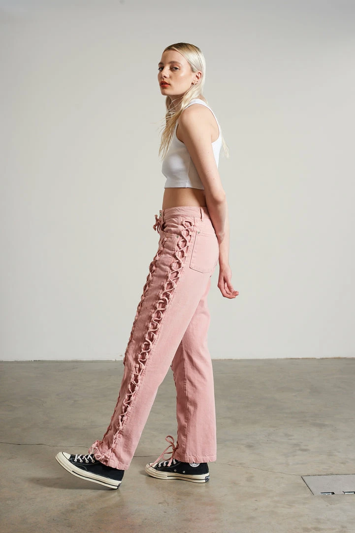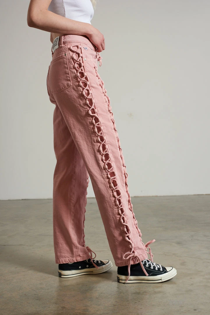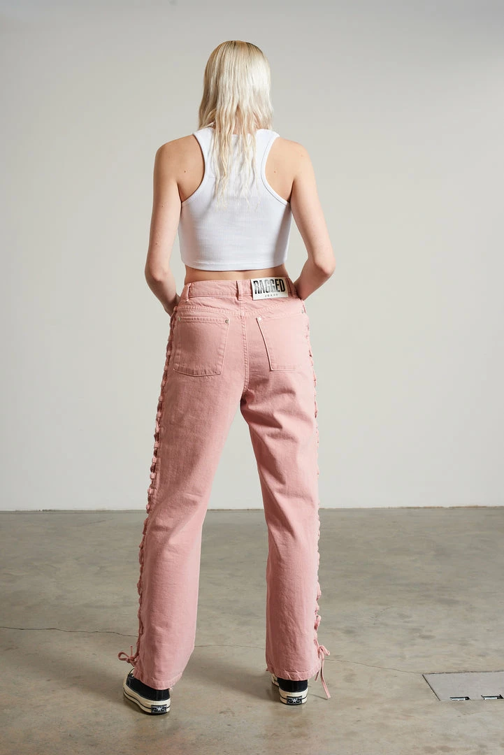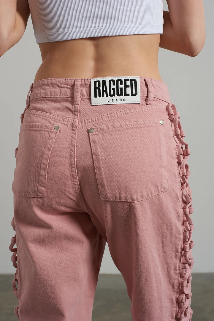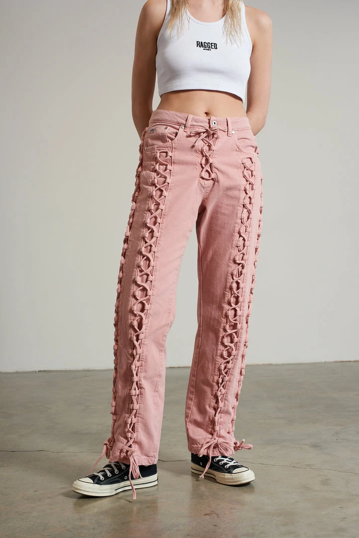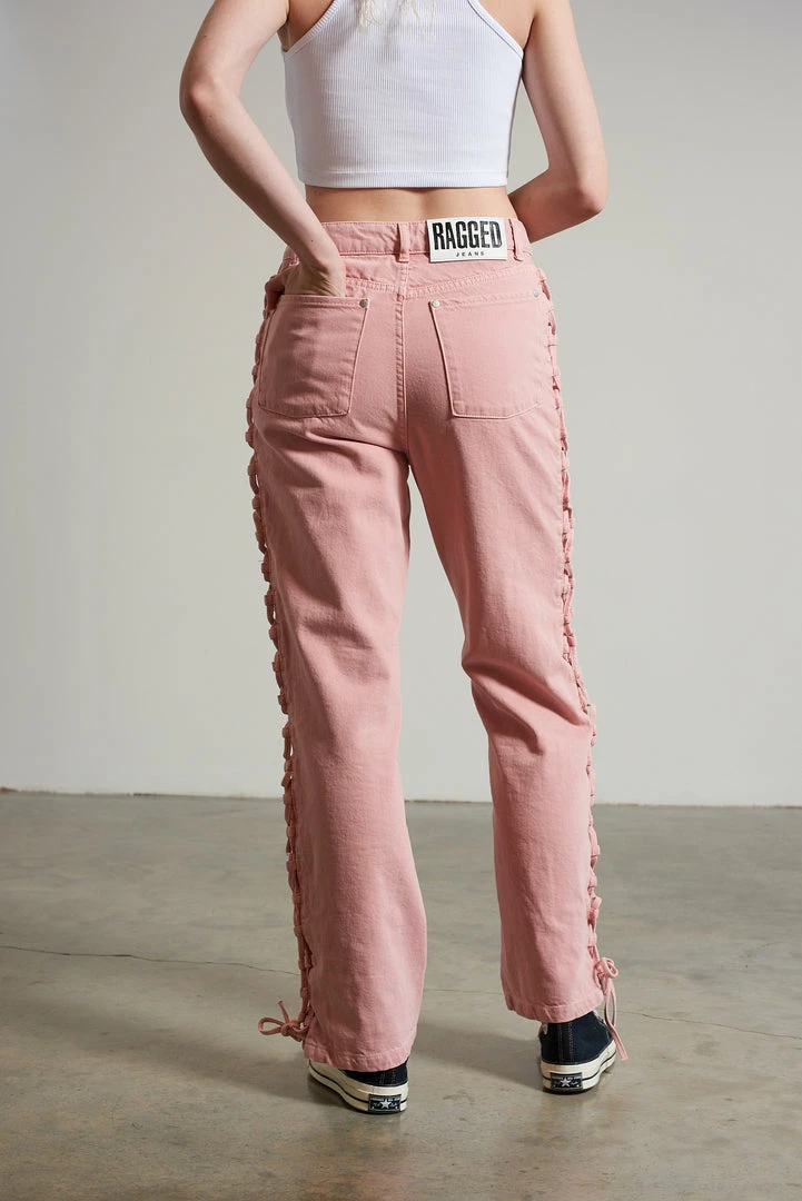 Ragged Jeans pink denim dad jean with lace-up detail.