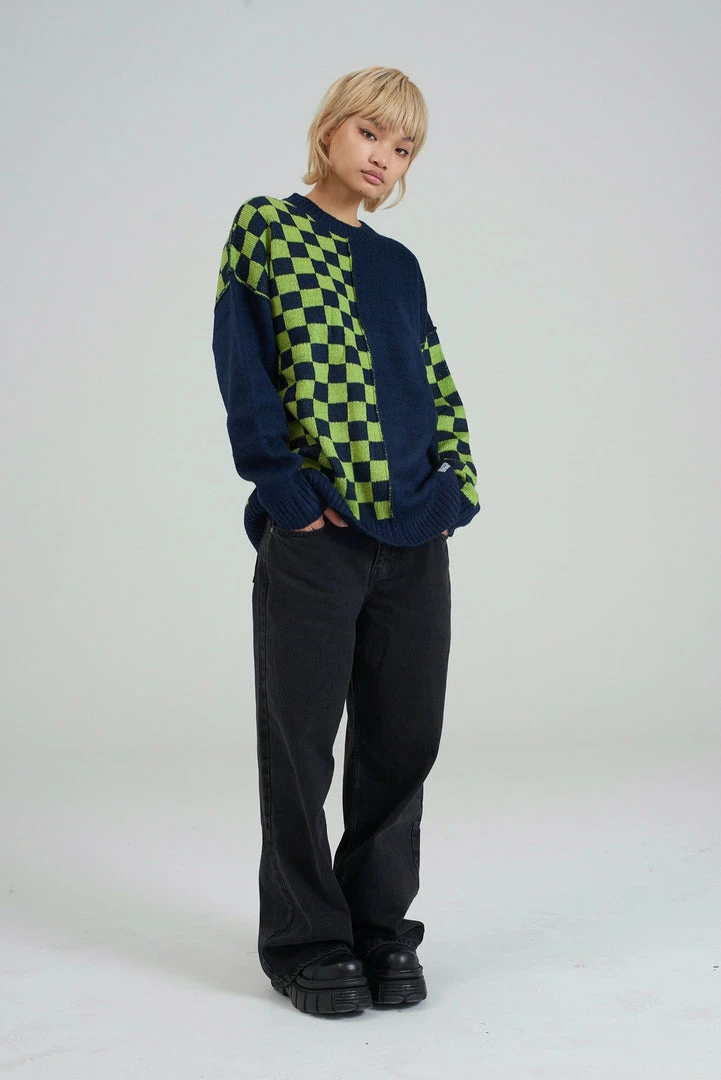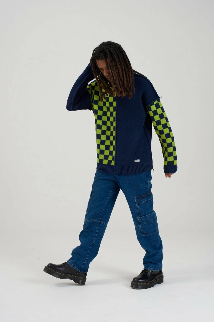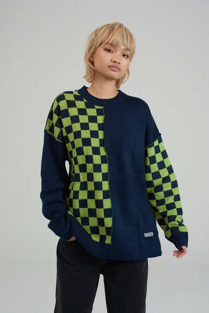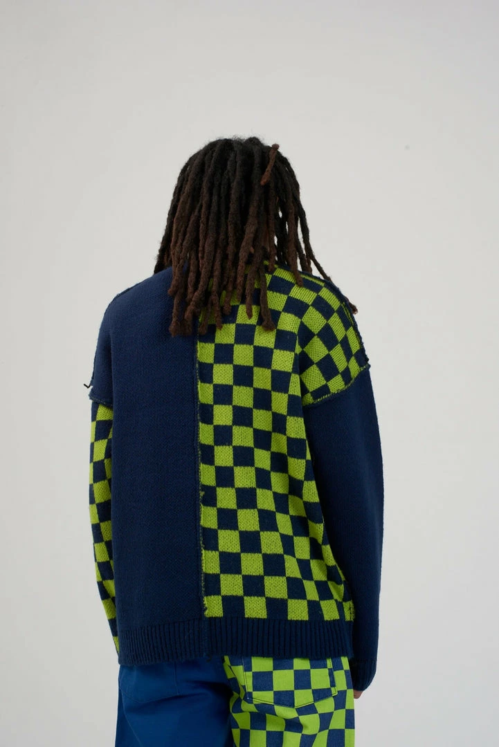 Ragged Jeans mens half and half blue and green checkerboard long sleeve knitted jumper.