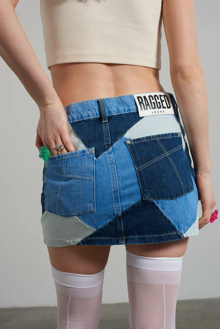 Ragged Jeans blue panel patchwork denim mini skirt.