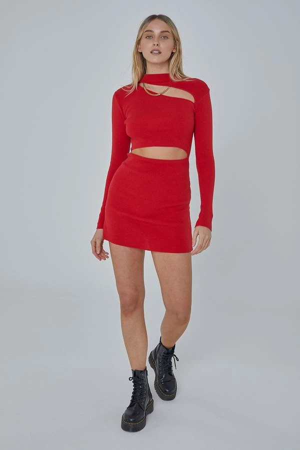 The Blaze Dress is our red long sleeve knitted mini dress. Crafted from recycled polyester and cotton, this mini dress features waist and neck cut out detailing.