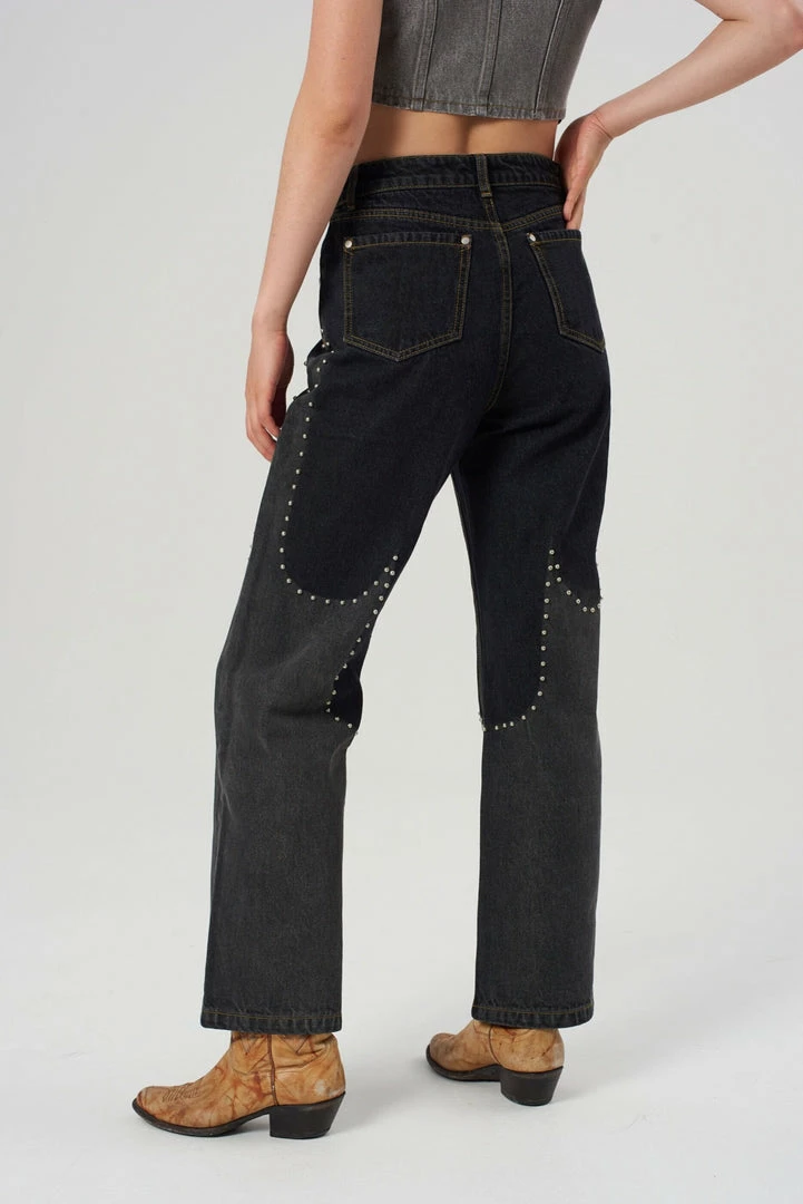 The Blaze Jeans are our charcoal denim flame design jeans with stud detailing. Crafted from viscose, polyester, and recycled cotton.