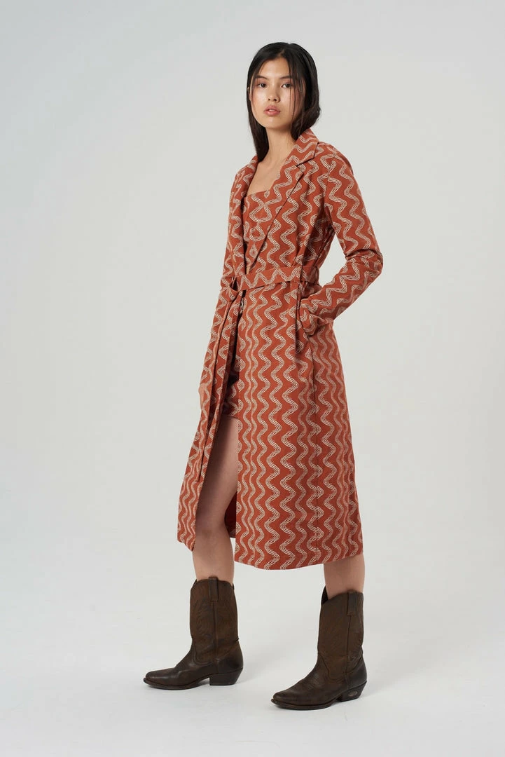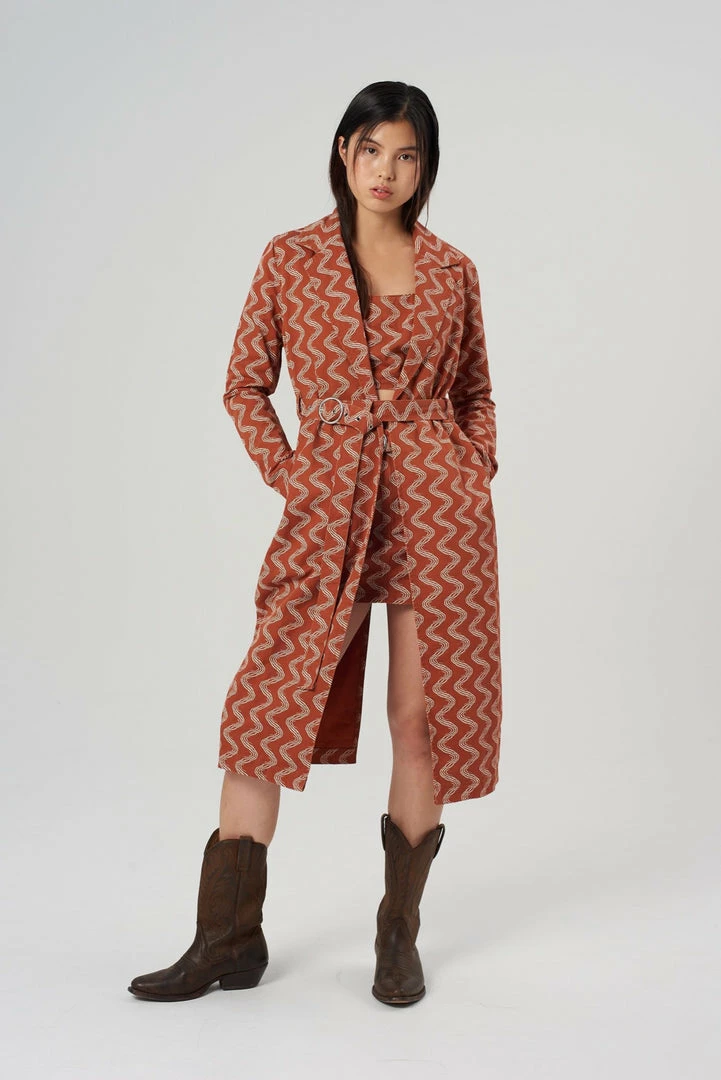 The Charm Coat is our rust wiggle print long length coat with circular buckle belt.