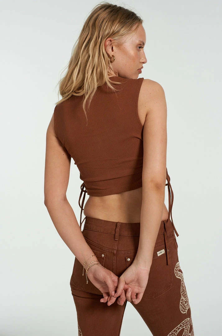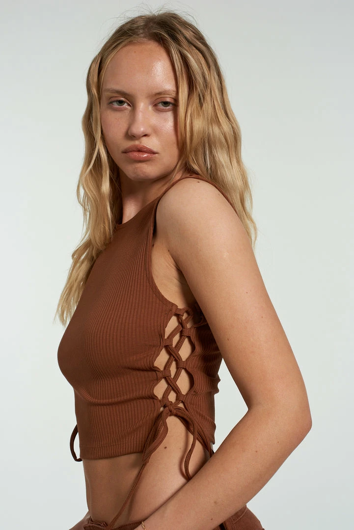 The Dusk Rib Vest is our brown crop top with cut out sides and lace up detail.