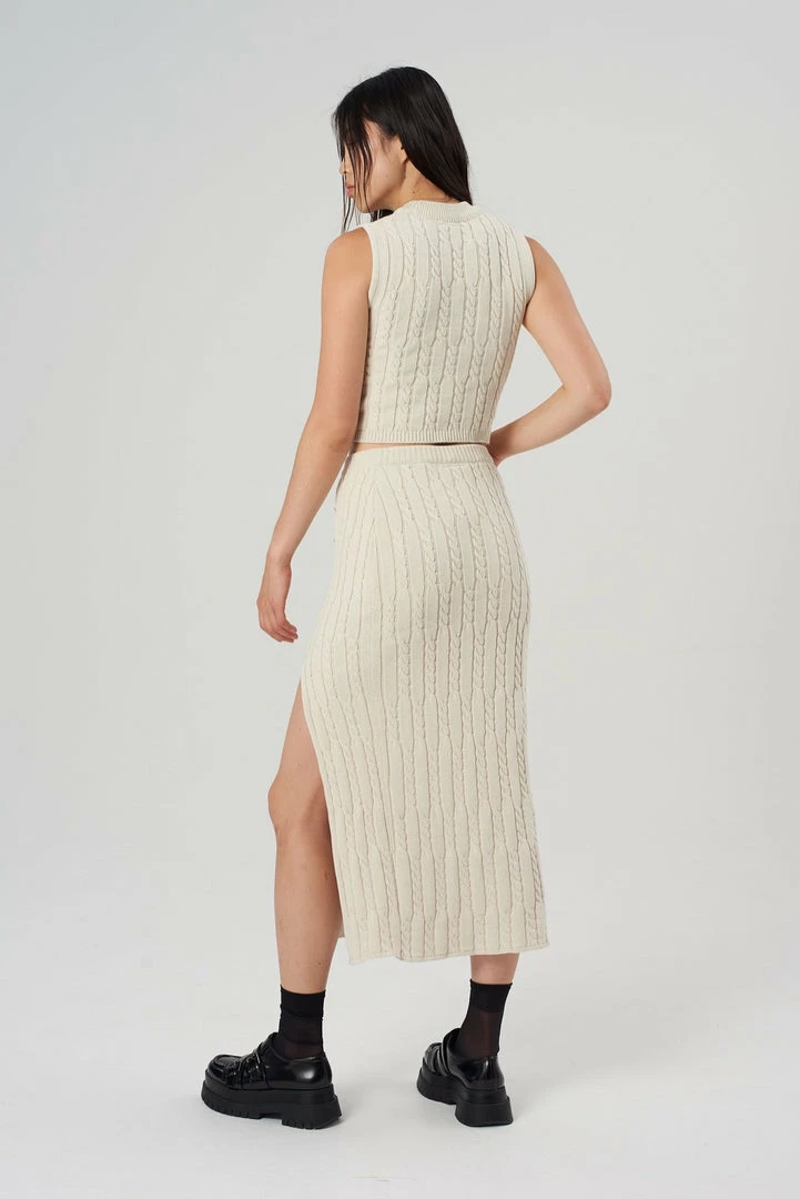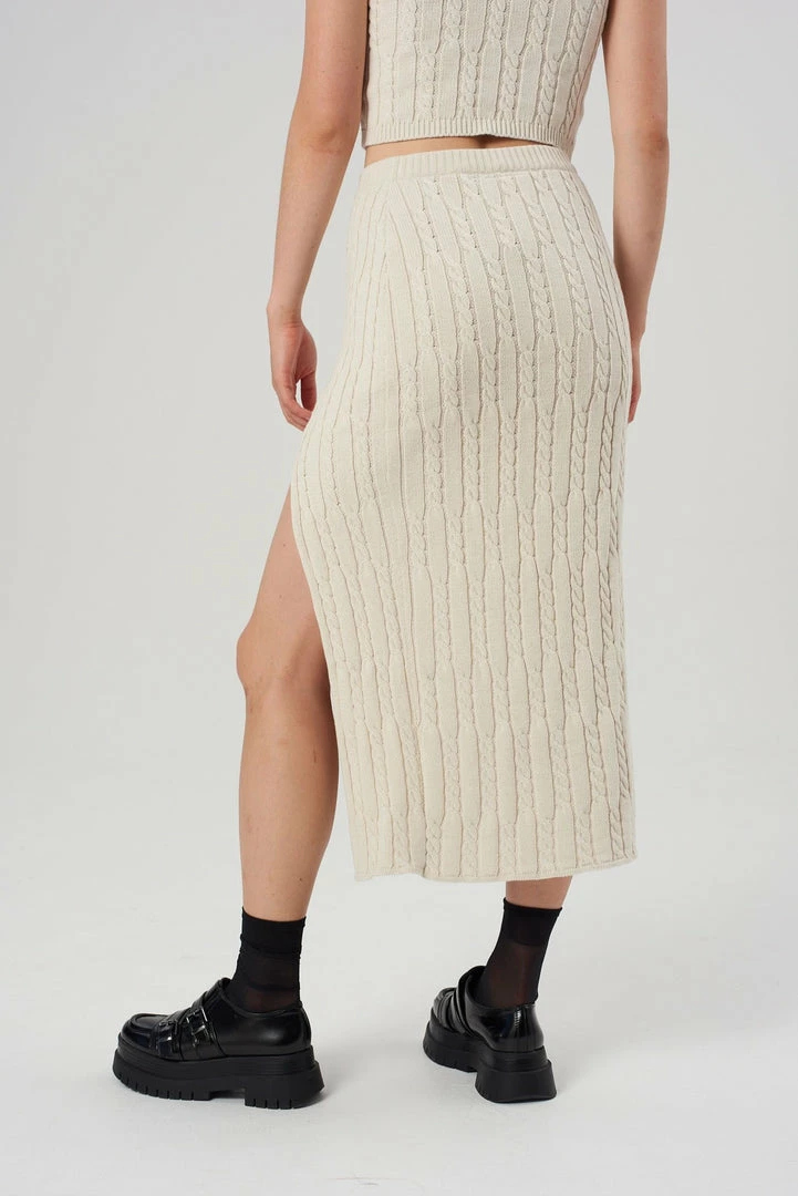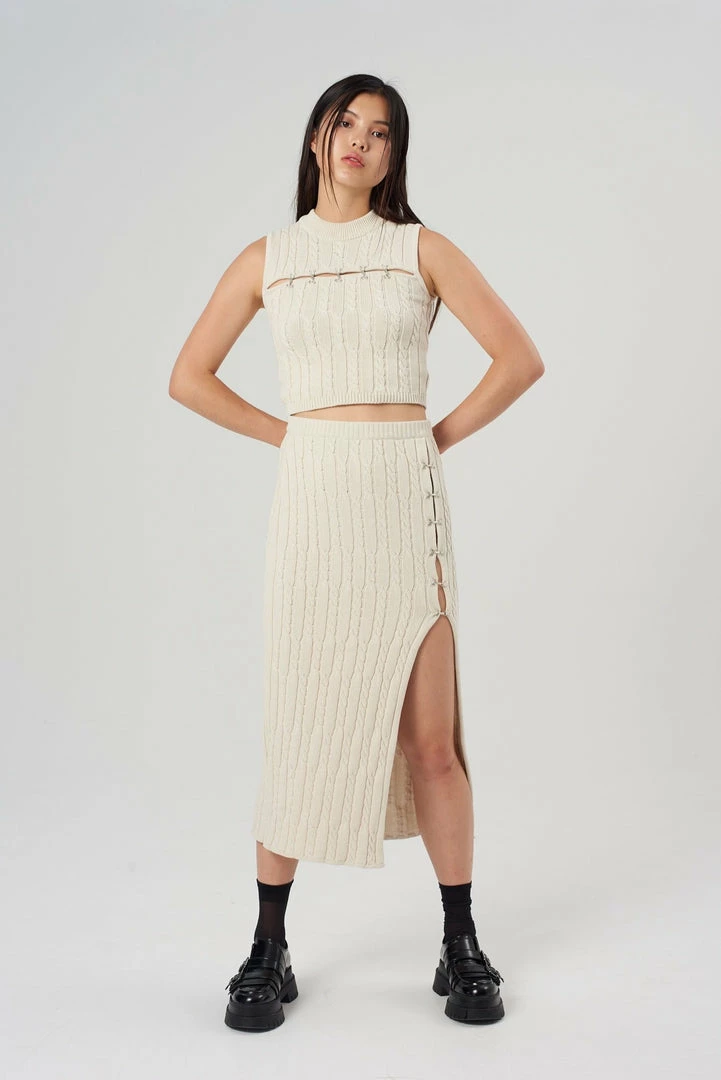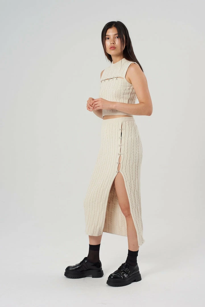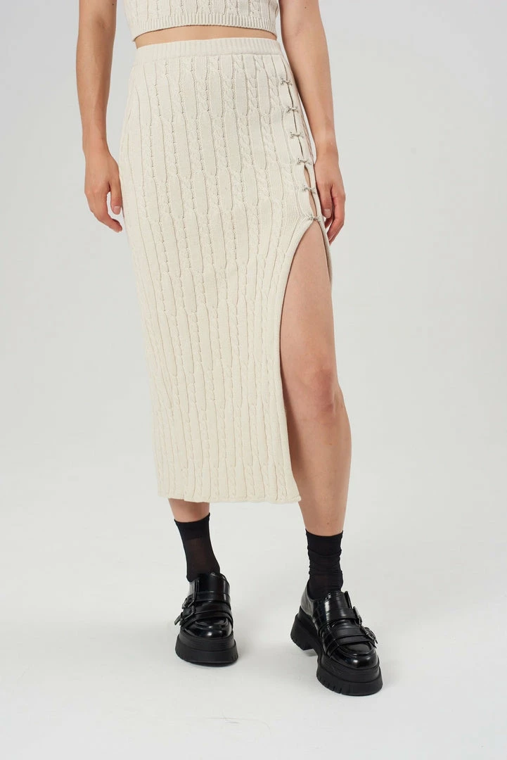 The Eclipse Skirt is our beige cable knit midi length skirt with safety pin detail.