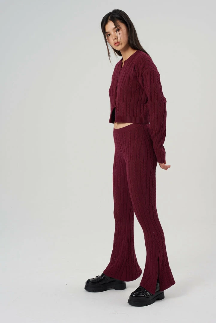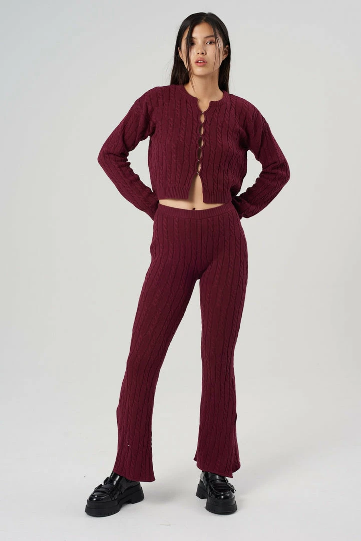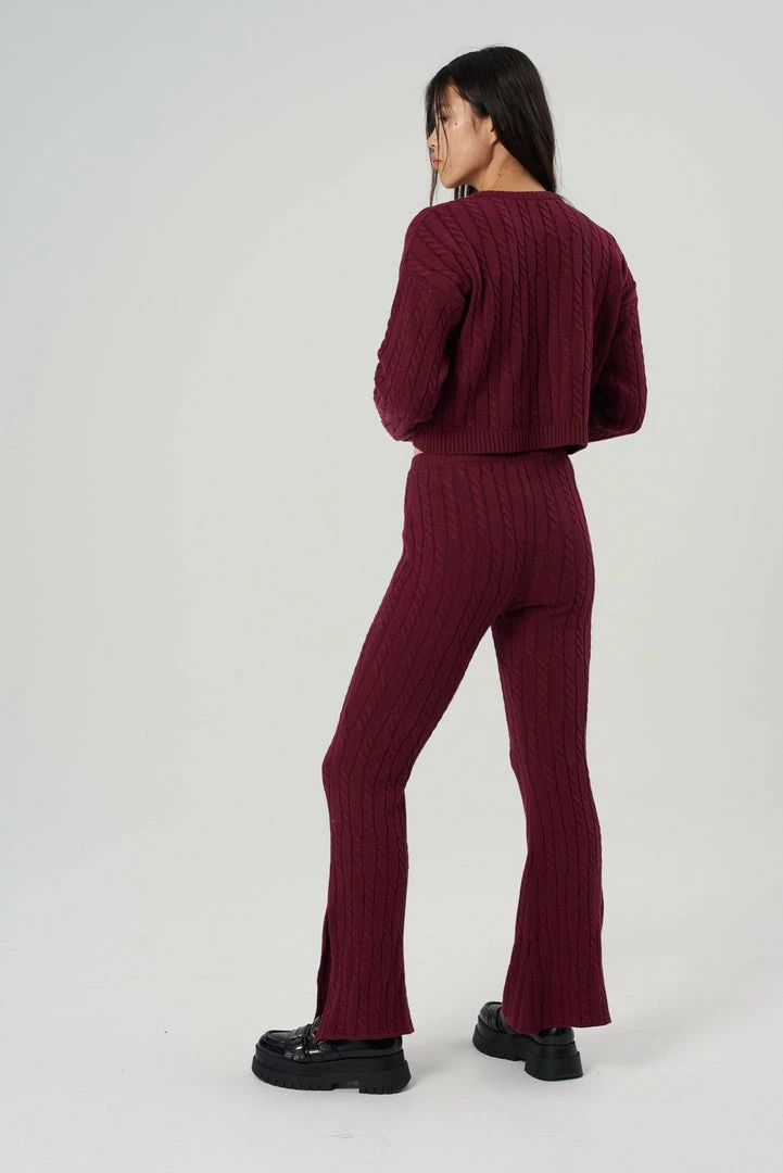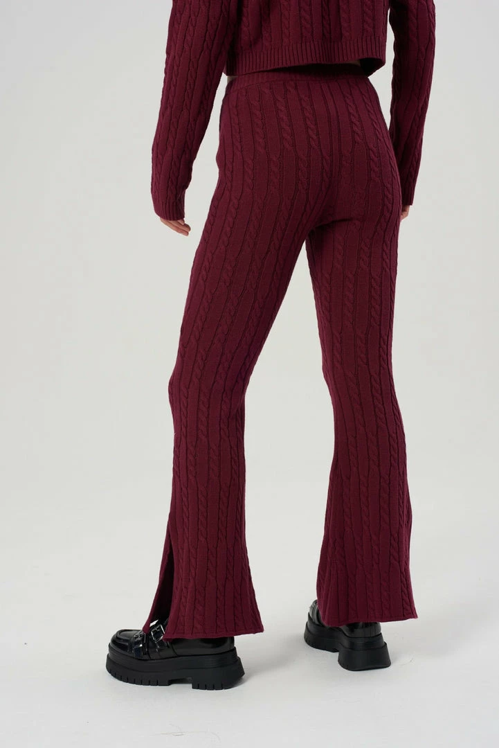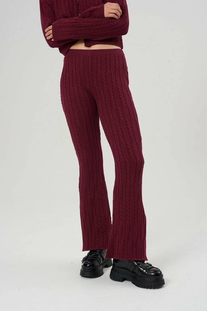 The Fever Flares are our red cable knit flares. Crafted from recycled cotton and recycled polyester.