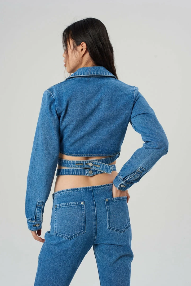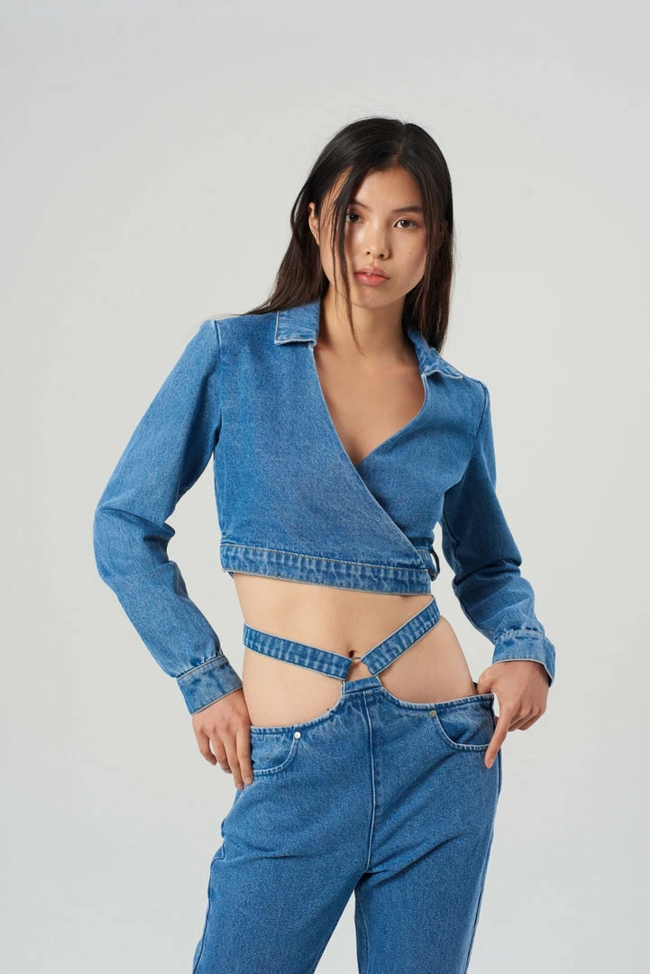 The Halo Top is our wrap around blue denim shirt. Crafted from viscose, polyester, and recycled cotton.