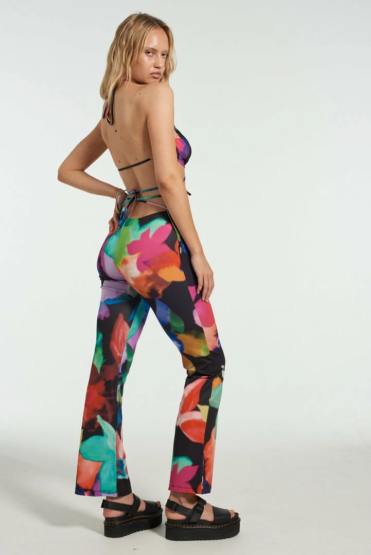 The Milk It Jasmine Strappy Bralette is our patterned ultra crop top with halter neck tie up and waist tie detail with central O ring.