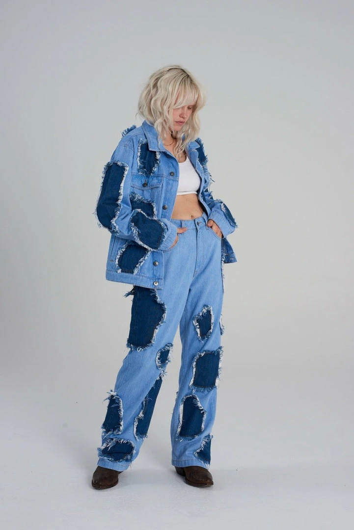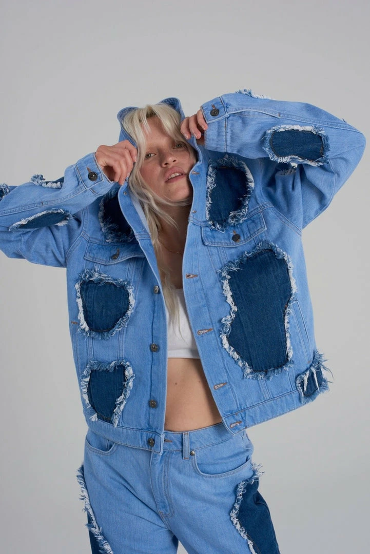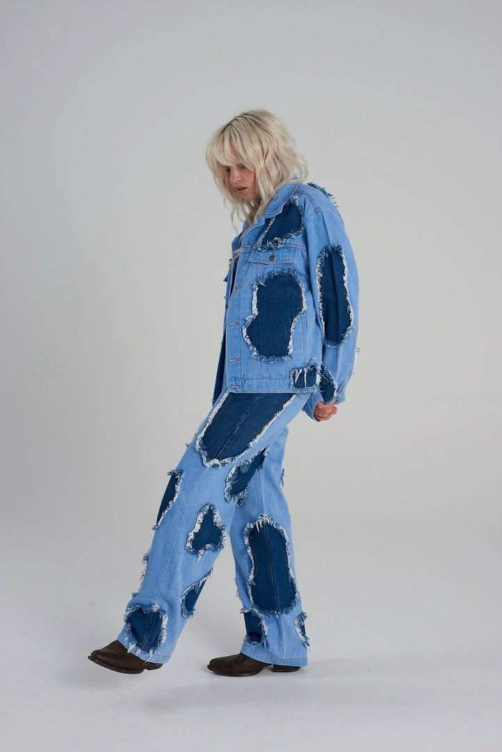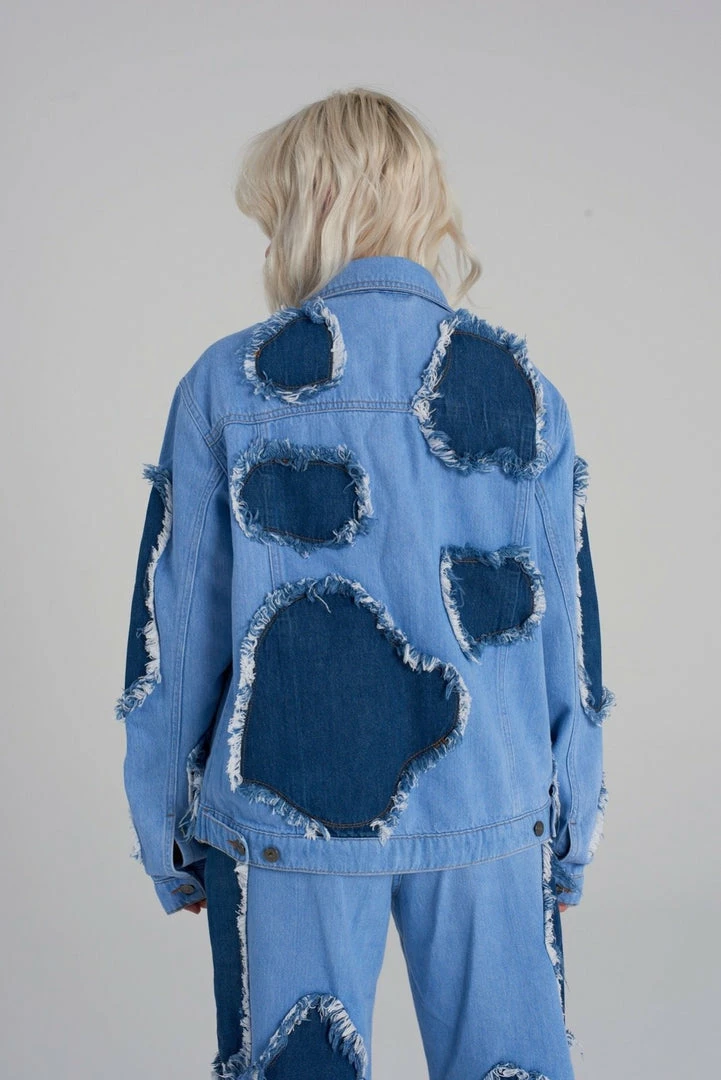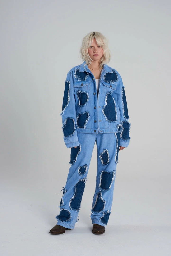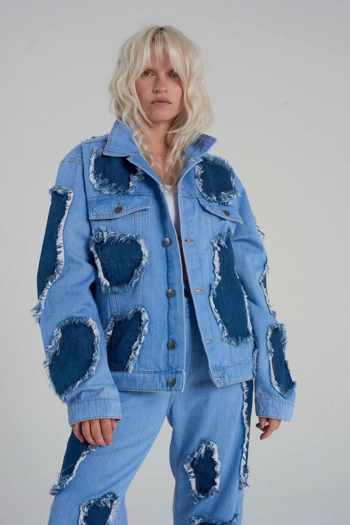 The Joleyene Jacket is our blue cow print recycled denim jacket. Crafted from 20% recycled cotton, this denim jacket features a distressed cow print design and button fastening.
