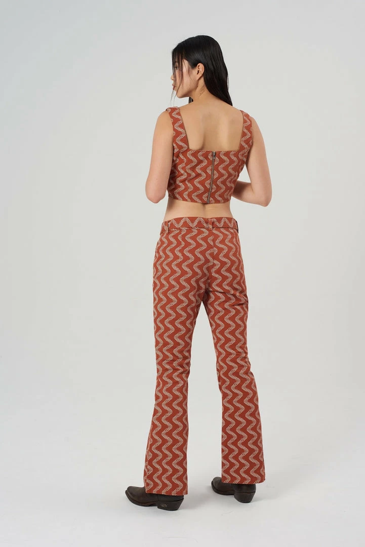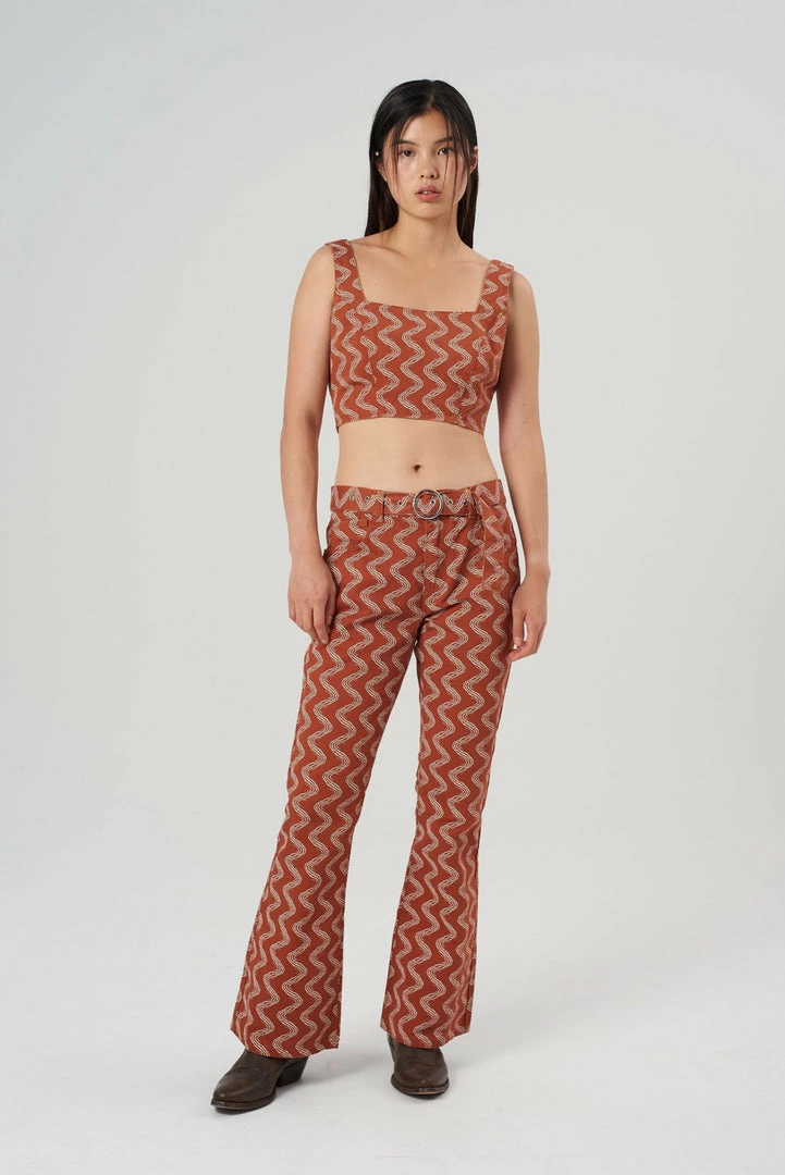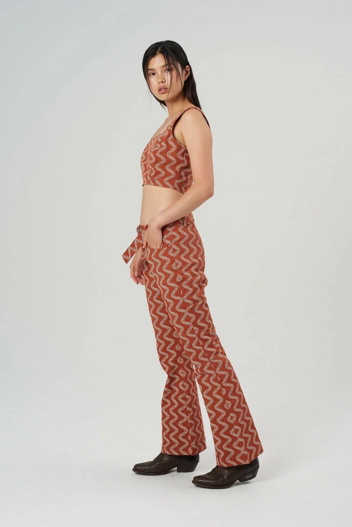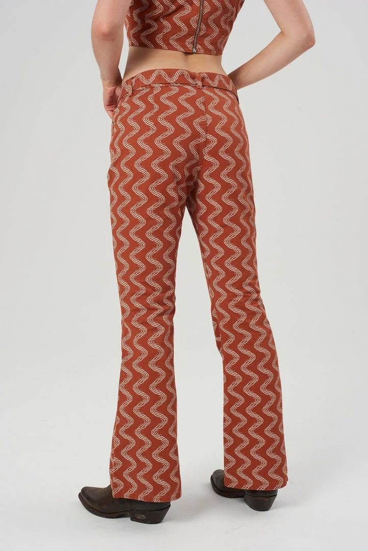 The Lure Pant is our rust wiggle print pant with circular buckle belt.
