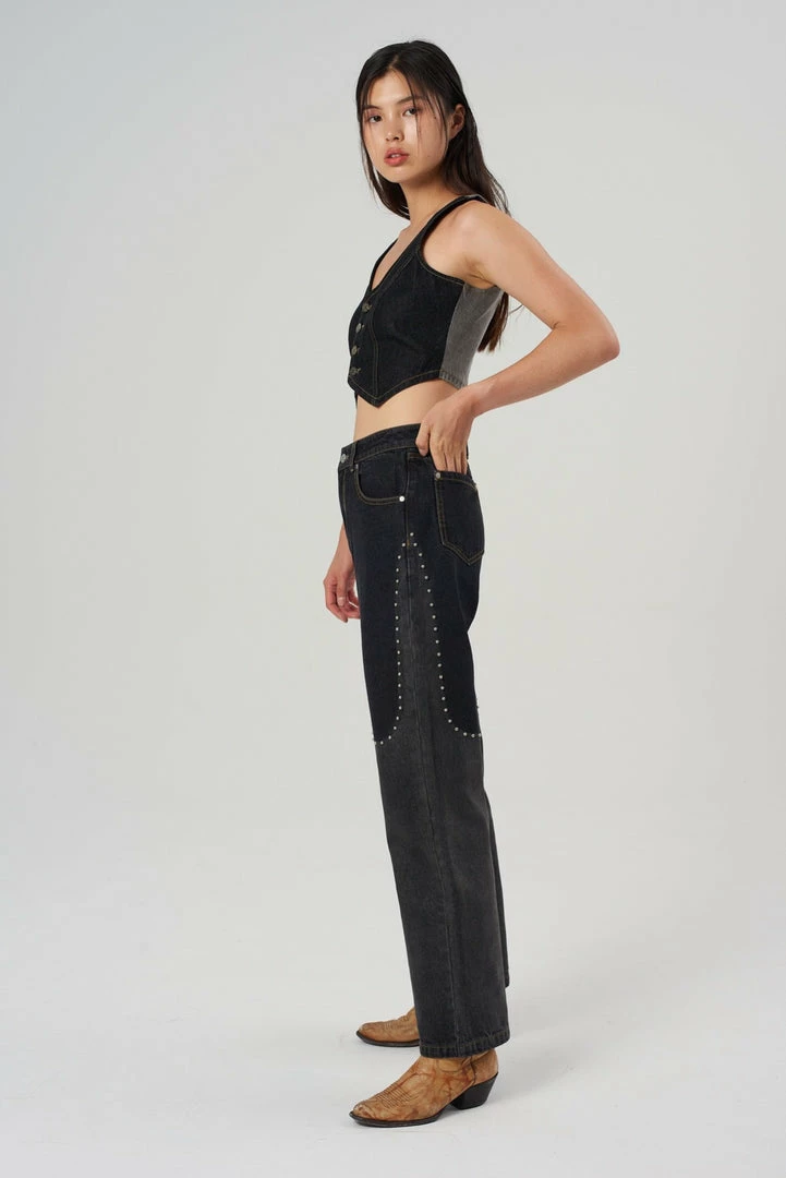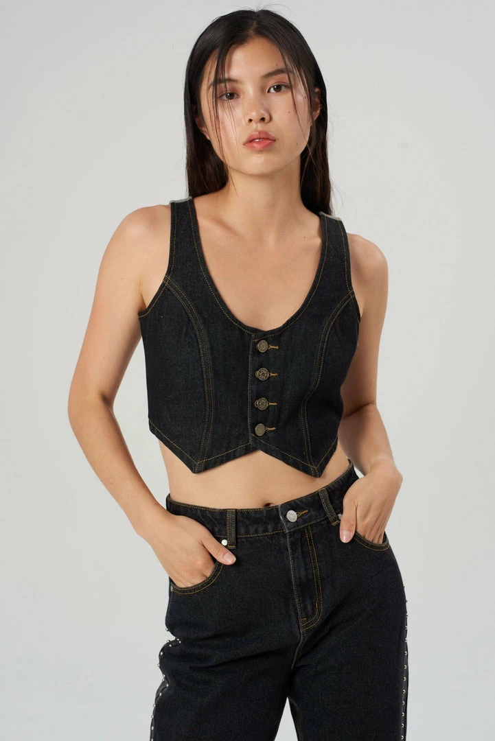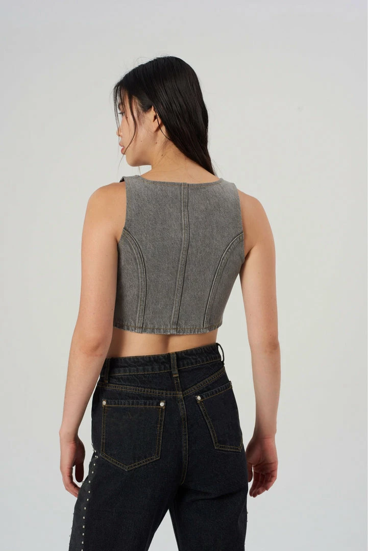 The Orb Waistcoat is our charcoal denim half & half waistcoat. Crafted from viscose, polyester, and recycled cotton.