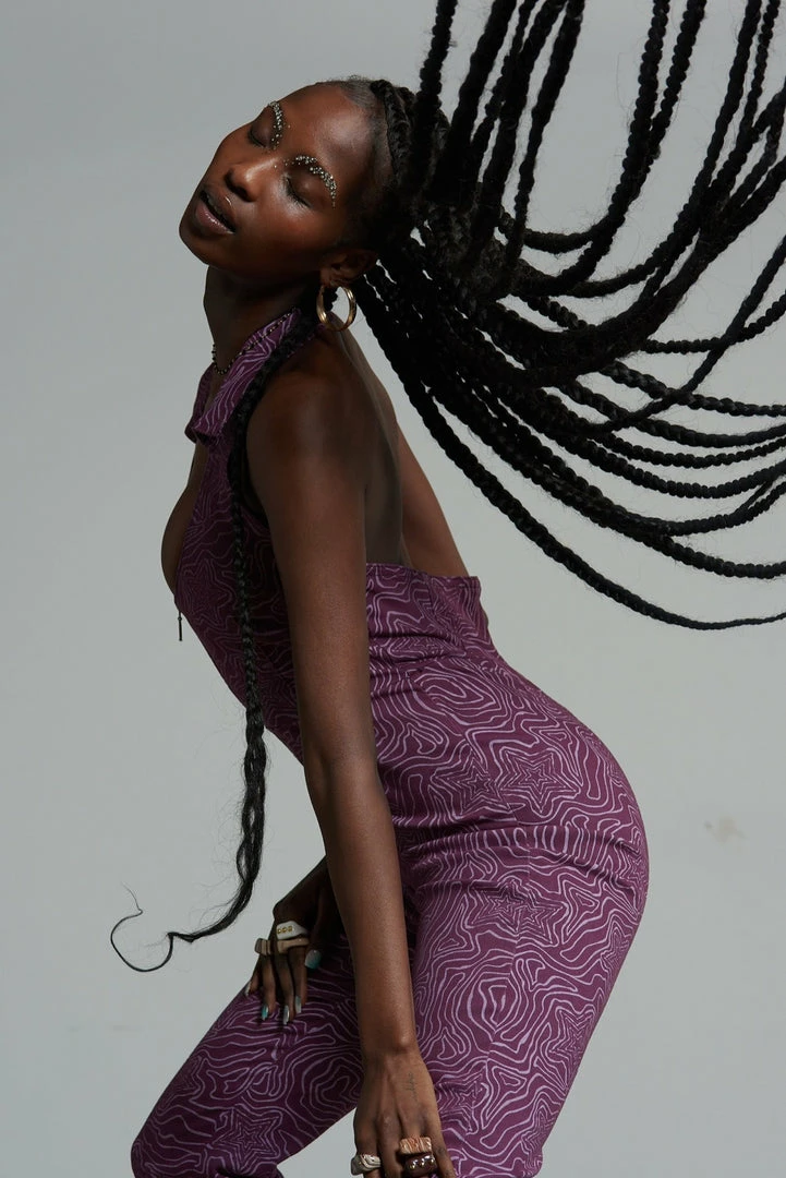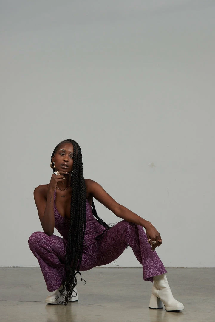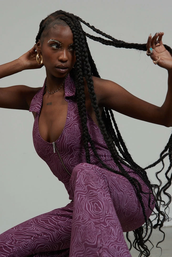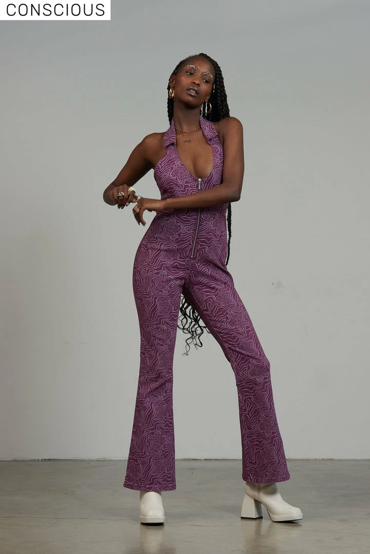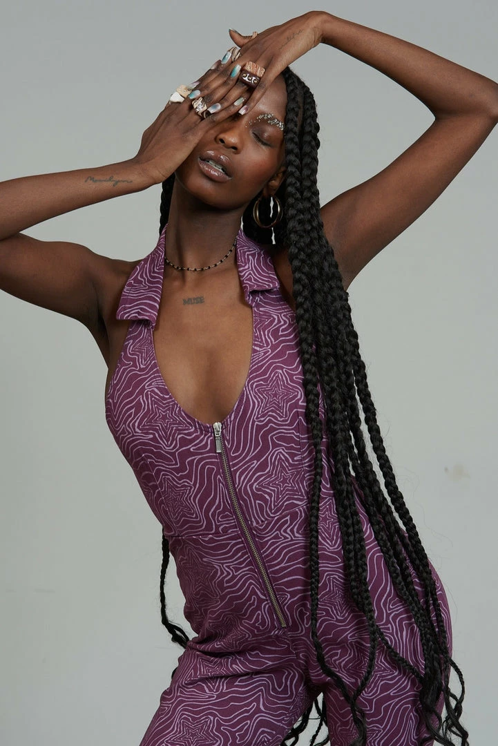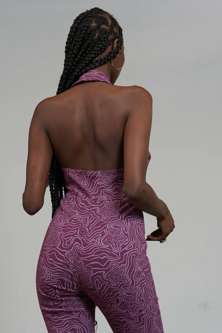 The Roxy Jumpsuit is our purple denim jumpsuit with all over statement wavy line star print. Crafted from 50% recycled cotton this jumpsuit features a front zip detail, a halter neck line and collar detail.