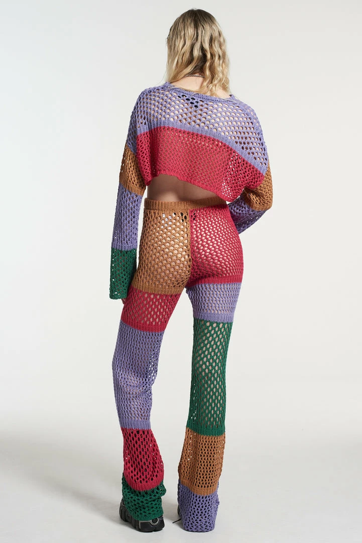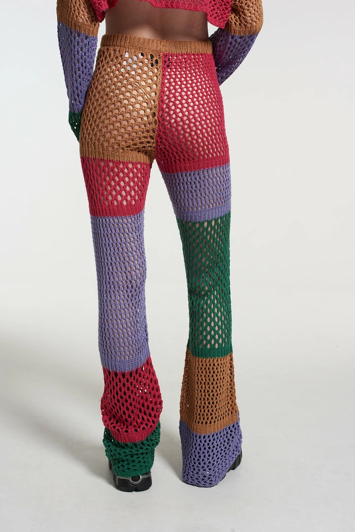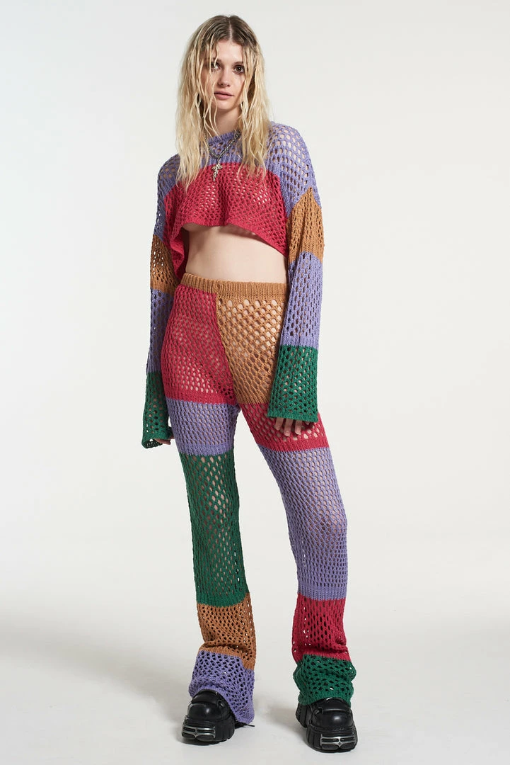 The Ragged Priest large fishnet style panelled knitted trousers.