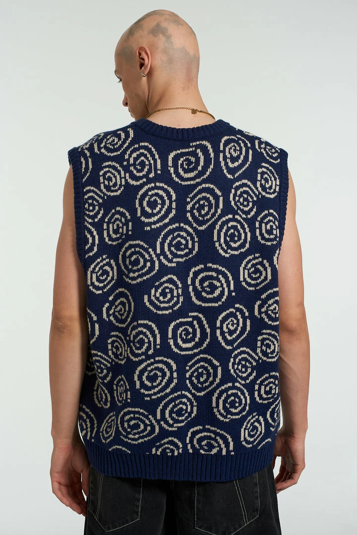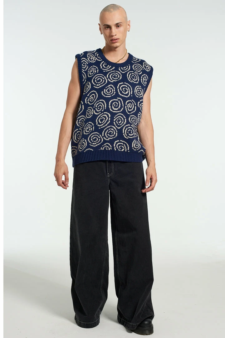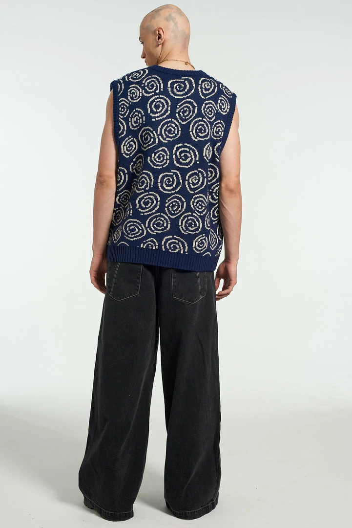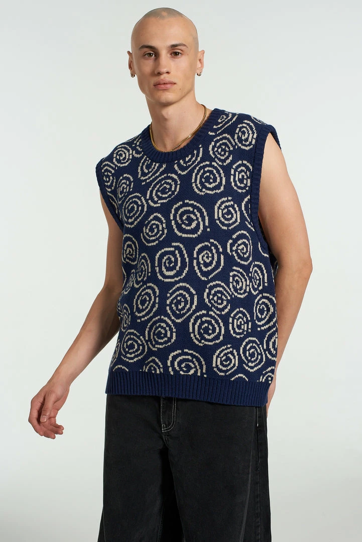 The Ragged Priest men’s Batik inspired swirl print knitted vest navy and white.