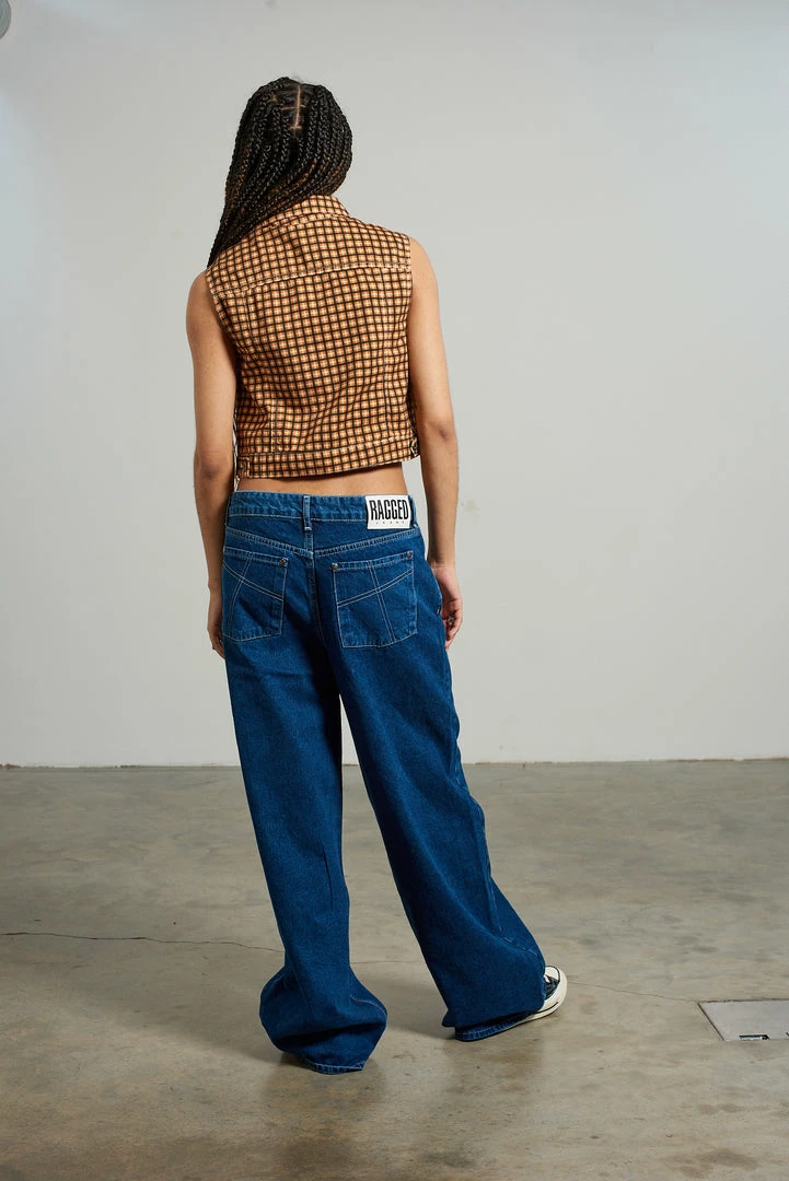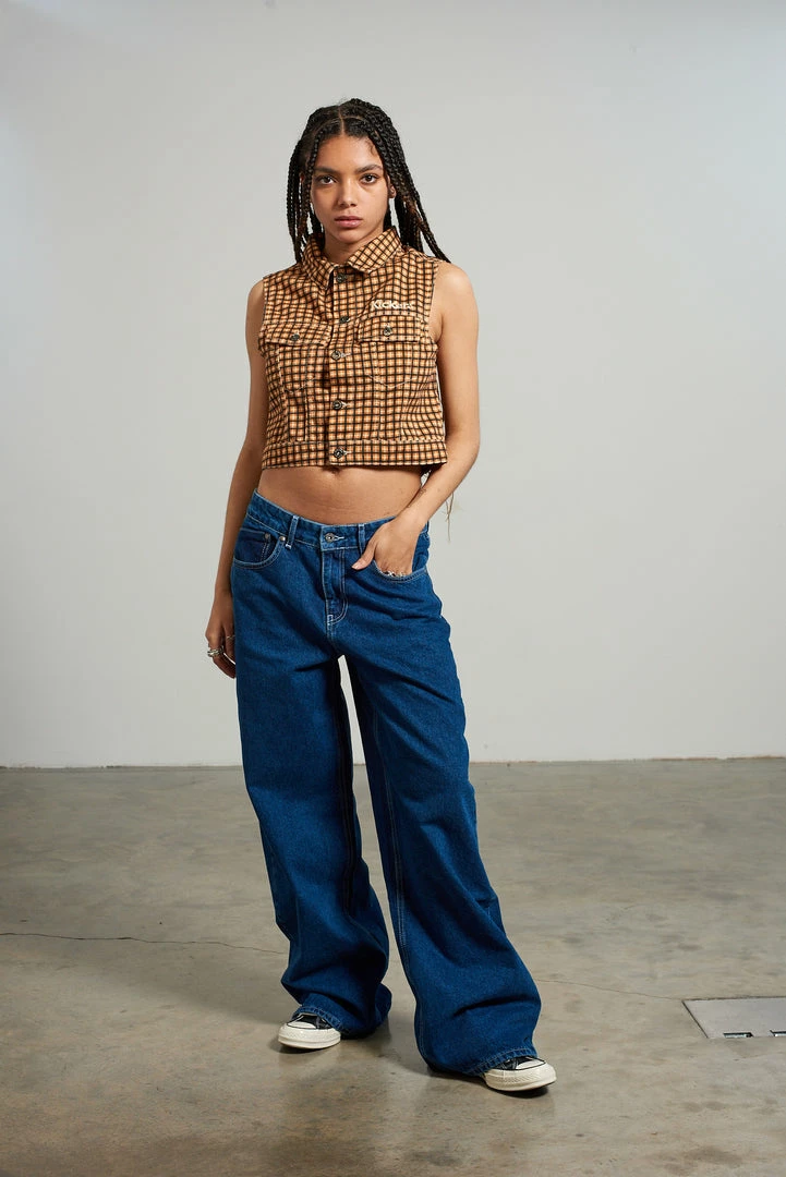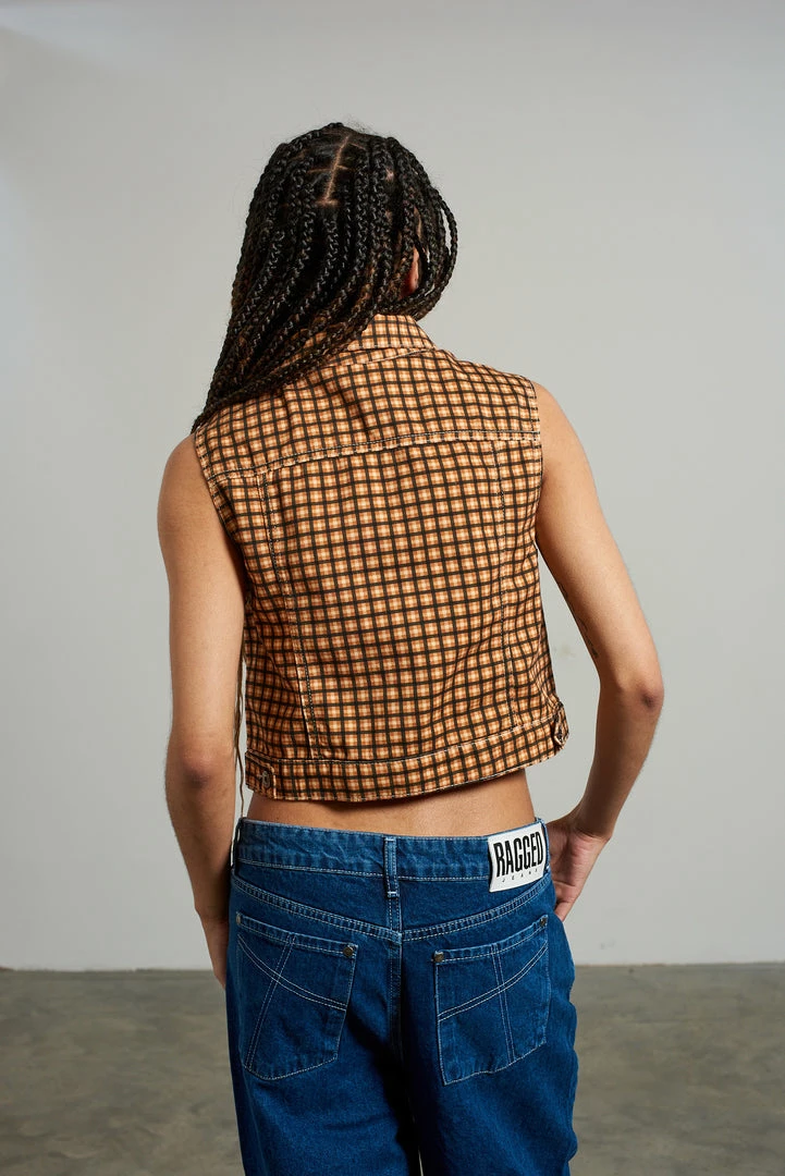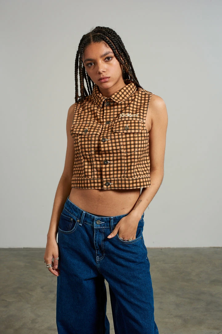 Kickers Classics check print sleeveless denim jacket.